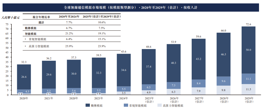 按照无线通信模块的类型来看,数传模块从2020年的人民币266亿元增长到2024年的人民币346亿元,复合年增长率为6.7%。未来由于对下游需求总量的增长预期,估计数传模块市场的增长将会加速,预计从2025年的人民币374亿元增长至2029年的人民币500亿元,复合年增长率为7.5%。受数字支付、智能家居等轻量化智能模块应用场景快速普及,全球常规智能模块市场预计将从2025年的人民币63亿元增长至2029年的人民币111亿元,复合年增长率为15.1%,但随着大模型、视频结构化、本地生成等高复杂度AI任务在终端侧的快速落地,产业对模块算力提出更高要求,部分原由常规智能模块承担的应用转向向高算力智能模块,导致智能模块的增长空间更多向高算力智能模块迁移。例如,在智能网联车领域,原本仅需要基础连接的T-Box单元现已被预期需要支持实时语音交互、高清流媒体等高级功能,推动汽车制造商用高算力智能模块取代常规智能模块。相比之下,AI下高算力应用场景的爆发,导致高算力智能模块的市场规模从2020年的人民币14亿元增长到2024年的人民币35亿元,复合年增长率为29.2%,并将从2025年的人民币49亿元增长到2029年的人民币115亿元,复合年增长率为23.9%。
