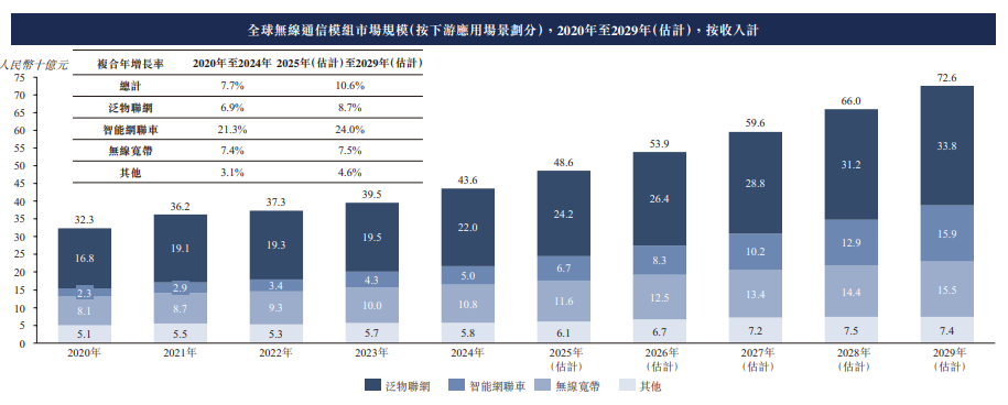 按照无线通信模块的下游应用场景来看,泛物联网场景无线通信模块市场规模从2020年的人民币168亿元增长到2024年的人民币220亿元,复合年增长率为6.9%。未来由于对泛物联网细分应用场景的扩张预期,预计泛物联网领域市场的增长将会加速,从2025年的人民币242亿元增长至2029年的人民币338亿元,复合年增长率为8.7%。随着智能网联车技术的不断升级,尤其是车载娱乐的普及,未来对无线通信模块的需求将大幅增加,以支持高速数据传输、低延迟通信和多设备协同,智能网联车场景无线通信模块市场规模从2020年的人民币23亿元增长到2024年的人民币50亿元,复合年增长率为21.3%。未来由于智能网联车在存量汽车市场的应用占比越来越高,智能网联车对无线通信模块的应用需求将同步扩张,预计智能网联车领域的市场增长将会持续加速,从2025年的人民币67亿元增长至2029年的人民币159亿元,复合年增长率为24.0%。同时,随着FWA/MBB在家庭宽带替代与企业无线接入中的加速部署,无线宽带对高性能、多制式融合的无线通信模块需求持续增长。预计无线宽带领域市场规模将从2025年人民币116亿元增长至2029年的人民币155亿元,复合年增长率为7.5%。