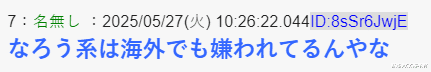 7:名無し :2025/05/27(火) 10:26:22.044 ID:8sSr6JwjEなろう系は海外でも嫌われてるんやな原来“网文套路番”在海外也被讨厌啊。