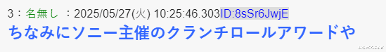 3:名無し :2025/05/27(火) 10:25:46.303 ID:8sSr6JwjEちなみにソニー主催のクランチロールアワードや别忘了,这个奖是索尼办的 Crunchyroll 颁的。