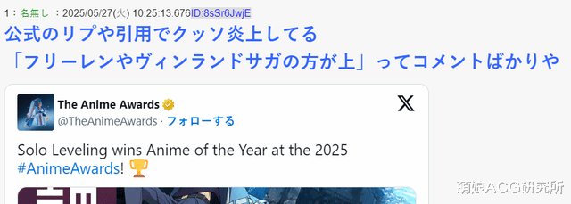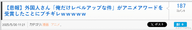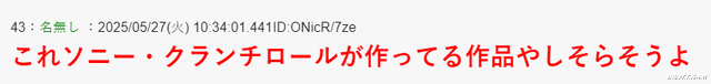 43:名無し :2025/05/27(火) 10:34:01.441 ID:ONicR/7zeこれソニー・クランチロールが作ってる作品やしそらそうよ《我独自升级》是索尼旗下 Crunchyroll 自己投的动画,能拿奖也正常吧……
