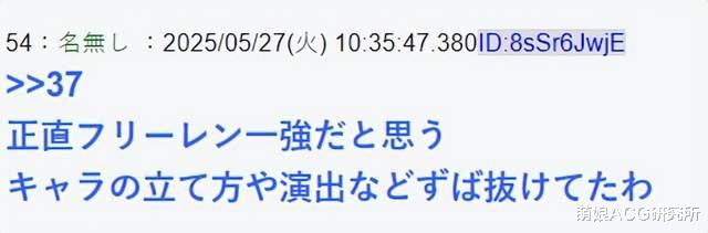 54:名無し :2025/05/27(火) 10:35:47.380 ID:8sSr6JwjE正直フリーレン一強だと思う キャラの立て方や演出などずば抜けてたわ说实话,今年应该是《芙莉莲》一骑绝尘,不论角色刻画还是演出都太强了。
