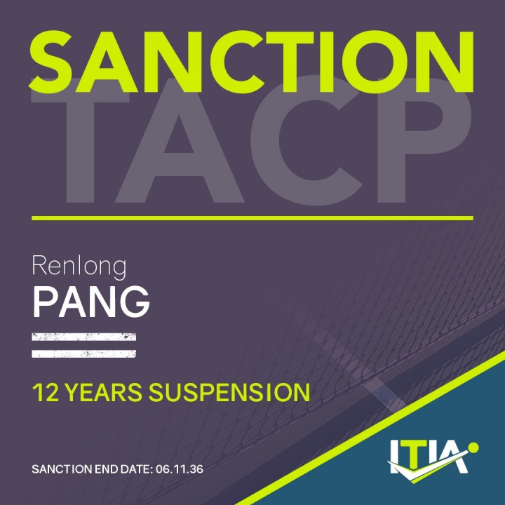 国际网球诚信机构(ITIA)确认对中国籍网球运动员逄仁龙禁赛12年并处以11万美元(暂缓执行7万美元)罚款,因其于2024年5月至9月间操纵或企图操纵22场比赛。