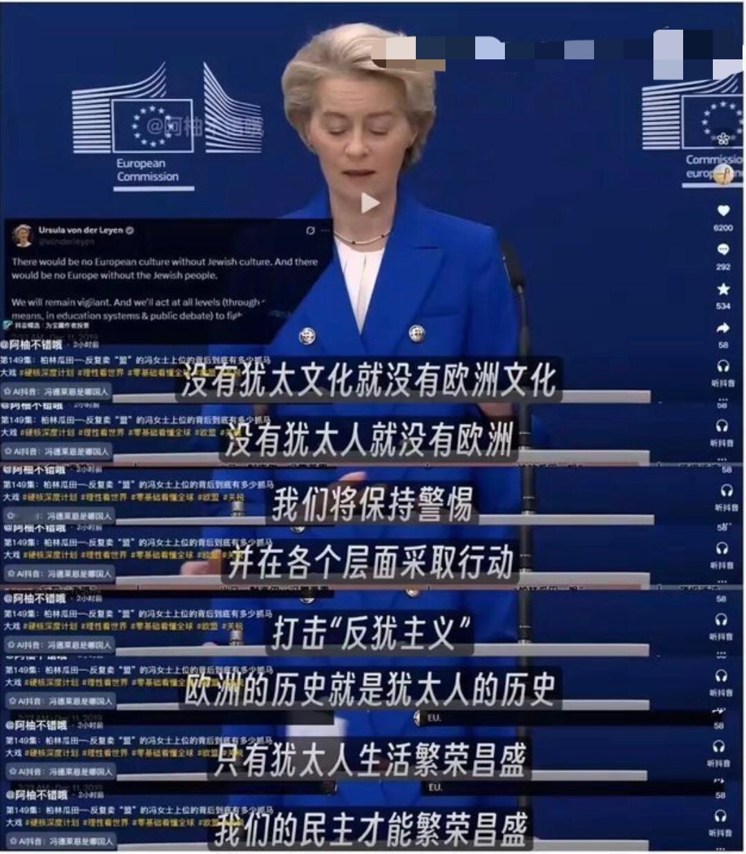 欧盟委员会主席冯德莱恩反复强调称:“让我明确地说,犹太历史就是欧洲历史,犹太文化就是欧洲文化,犹太人的生活得以繁荣,欧洲才能完全兴盛。 没有犹太文化就没有欧洲文化,没有犹太人就没有欧洲,我们将保持警惕,并在各个层面采取行动,打击“反犹主义”,因为欧洲的历史就是犹太人的历史,只有犹太人生活繁荣昌盛,我们的民主才能繁荣昌盛。” 懂了,犹太人是欧洲人的祖宗,犹太人对于欧洲意味着一切,反对犹太人的就不是欧洲人,如果没有犹太人,世界上就没有欧洲了。