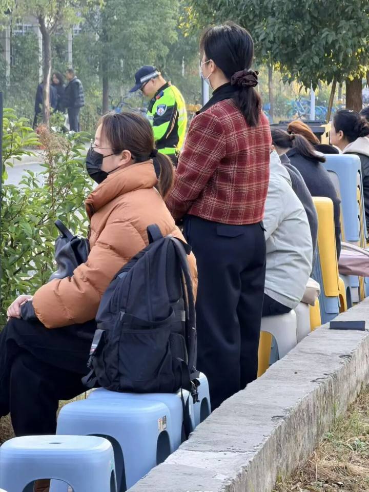 学校在马路对面贴心摆放了许多塑料凳,供考生和家长休息。不少考生今天起得早,直接在路边买了早饭拎着过来,也坐在了凳子上一边吃,一边看资料。