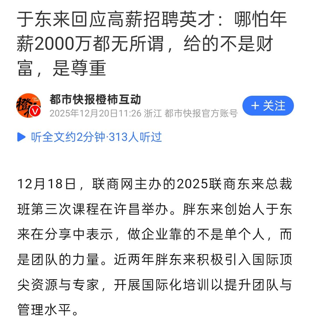 对企业而言,真正的人才一定是无价之宝。 只要人才有能力,也确实能为企业创造价值,企业要学会舍得才行。 正如于东来所说,他给人才的不是财富,而是尊重,这是肺腑之言。 经过这么多年来的发展,胖东来之所以能够成为中国商超界的一面旗帜、一个榜样,最重要的原因就是其拥有与众不同的人才观。