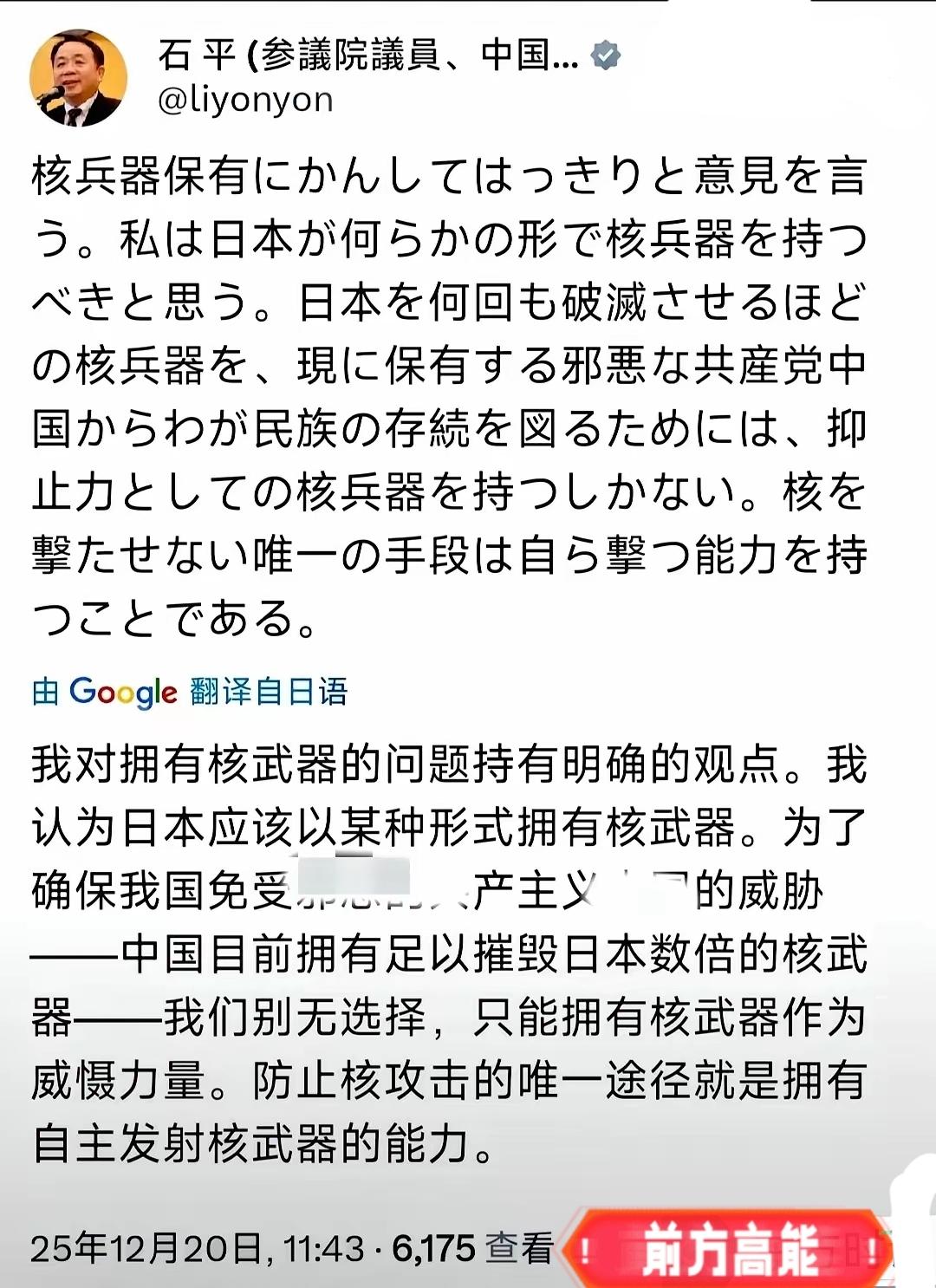 石平这个大汉奸又出来上蹿下跳了,他在12月20日发文:我认为日本从某种形式上应该拥有核武器,因为中国拥有可以摧毁日本的数倍核武器。防止核攻击的唯一途径,就是拥有自主发射的能力。 你别说,你还别说,他最后一句冷不丁一听,似乎有那么一点道理。但是仔细一咂摸,要是按照他的理论,世界每一个国家都应该拥有核武器啊。 照这个歪理,那全世界两百多个国家和地区都得人手一套核武库才算公平?到时候地球不是成了个挂满炸药的火药桶? 说到底,石平这种数典忘祖的货色,不过是拿着荒谬逻辑给日本的核野心摇旗呐喊,骨子里满是出卖民族的奴颜婢膝。 苍天饶过谁,不信,我们且往后看~