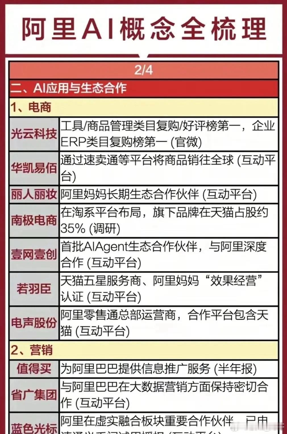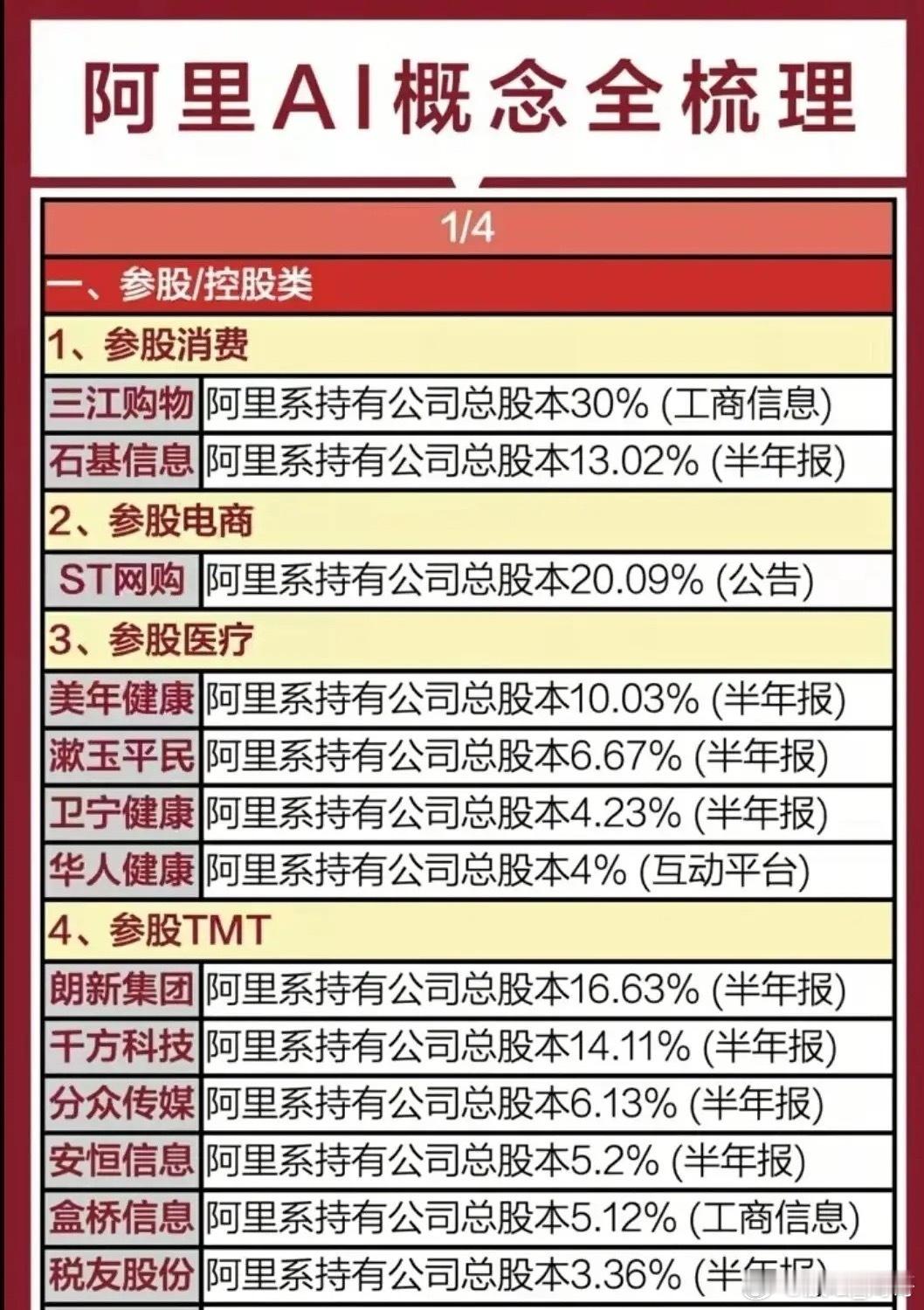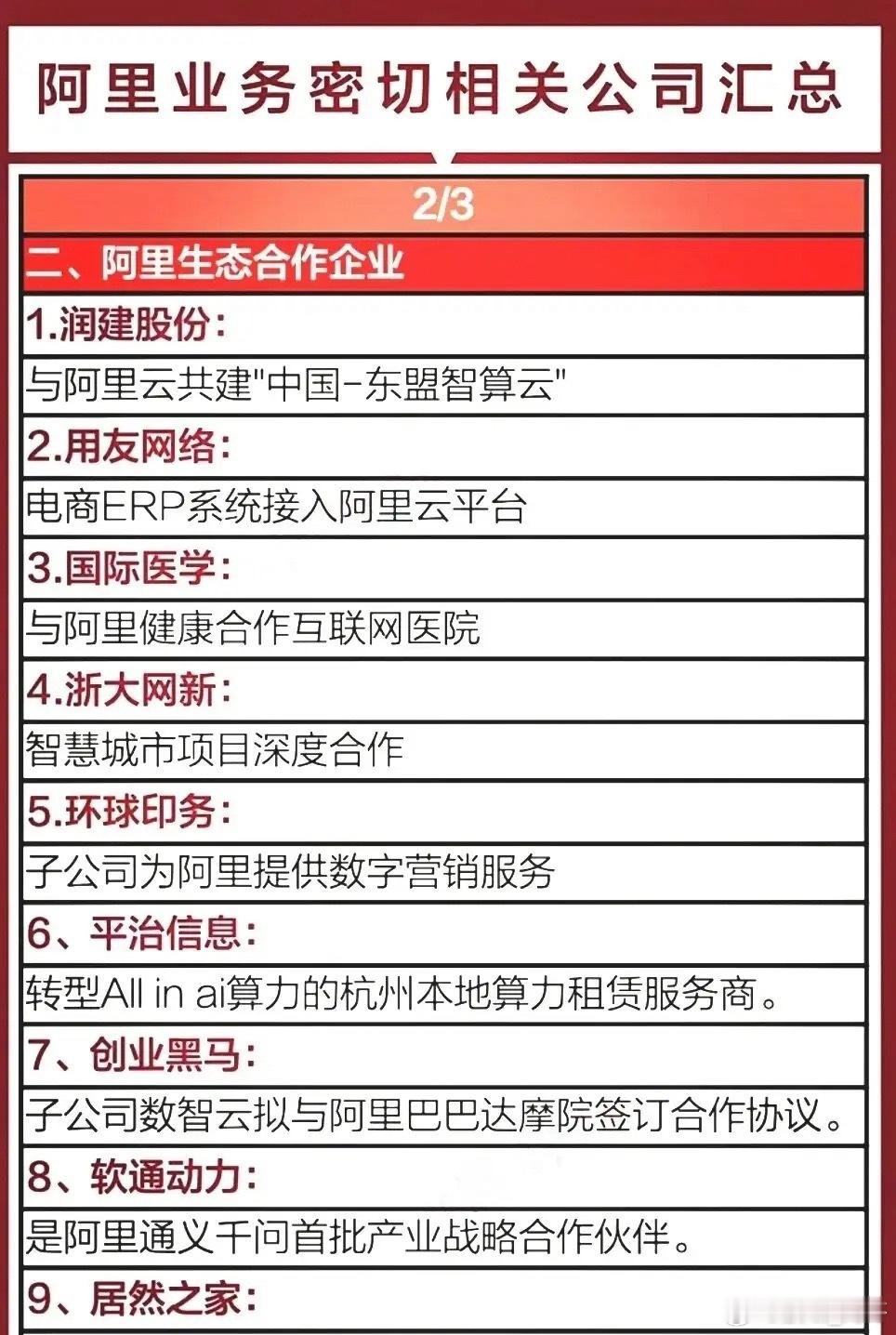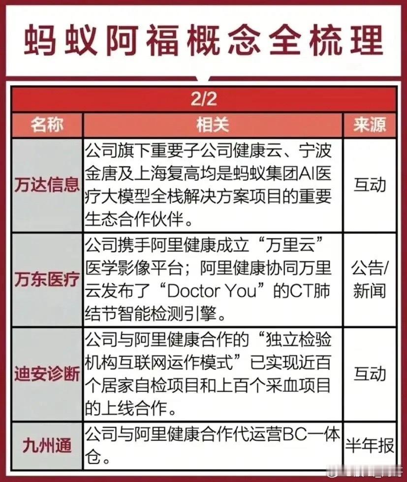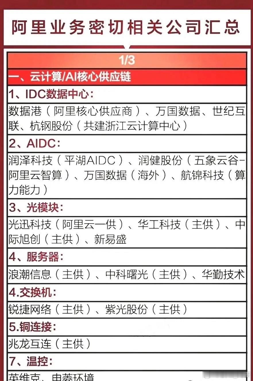 阿里AI题材概念集合整理!(阿福AI健康+阿里算力+阿里AI概念)周末最新消息,12月20日阿里国际站在梧州举办AI赋能宝石首饰跨境电商交流会,助力产业出海。另外,蚂蚁阿福月活1500万+,国内AI App前五、健康类第一!阿里/蚂蚁AI相关概念龙头代表有哪些?从云计算到AI,阿里的技术底盘背后,藏着一整套深度绑定的供应链与生态伙伴!蚂蚁阿福概念龙头代表有美年健康、万东医疗等等;阿里算力概念龙头代表有数据港、润泽科技等等;阿里AI概念龙头代表有三江购物、石基信息等等……阿里系通过持股+合作,把AI芯片、云服务、医疗大模型、健康服务平台的能力,和实体医疗资源、硬件厂商打通,这盘AI健康的棋,正越下越全。未来阿里不再是简单的电商平台,更是科技巨头!