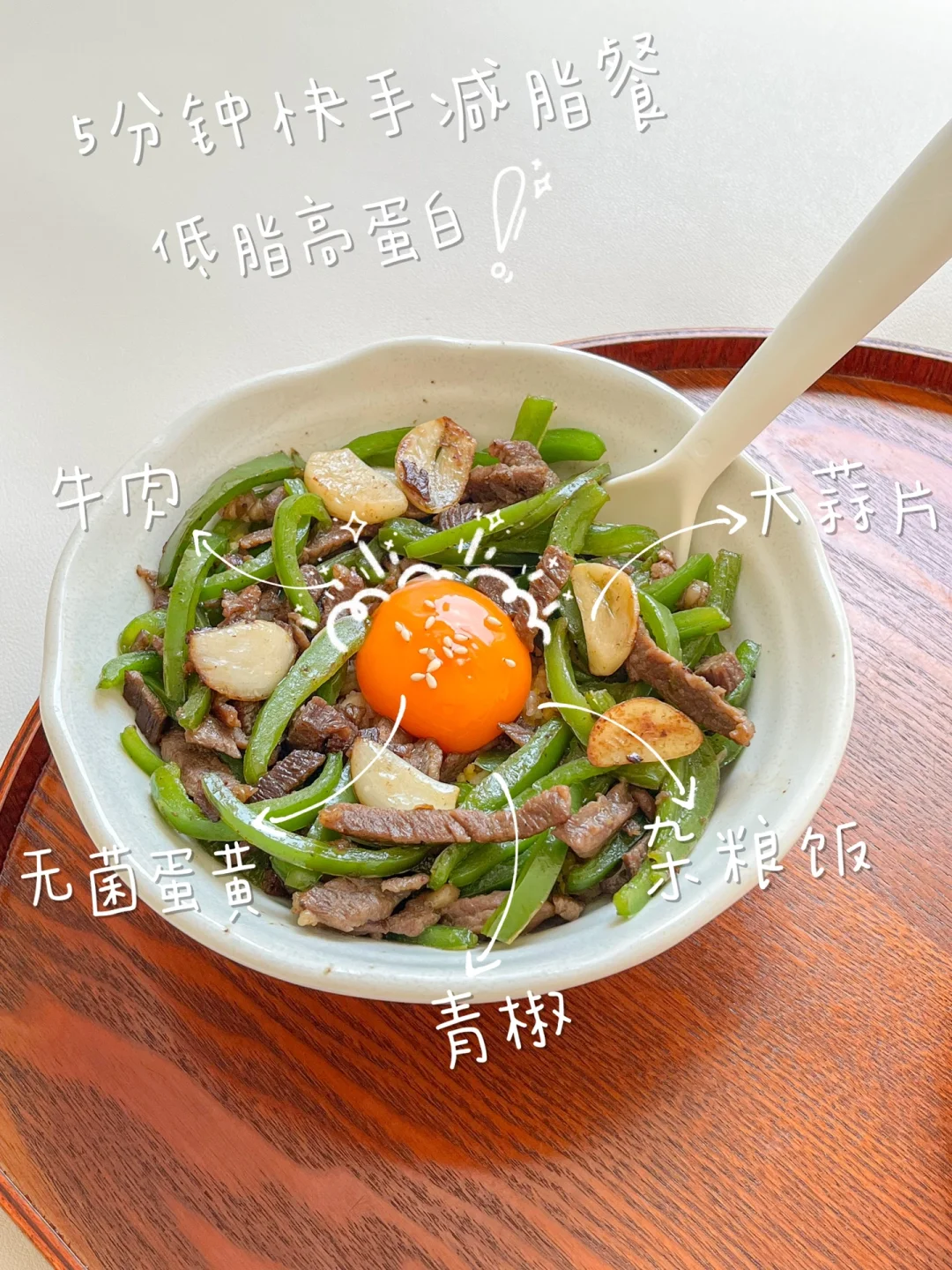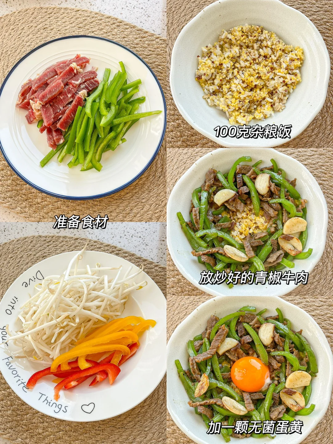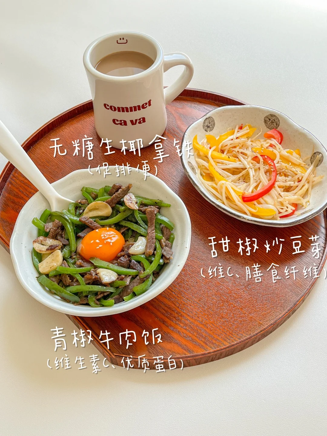 “改变饮食结构和饮食习惯,比节食减肥有用 一日三餐尽量按时吃,尽可能吃的丰富” 今日减脂午餐: ¹青椒牛肉饭 ²甜椒炒豆芽 ³无糖生椰拿铁 🟢青椒牛肉饭 牛肉蛋白质含量很高,适合在减脂期吃。用牛排自带的油脂就够了,不需要放太多的油。牛肉炒到六成熟先盛出来,再炒青椒丝,调味只放了黑椒酱,很简单也很美味[哇R] 🔴甜椒炒豆芽 豆芽和甜椒都有丰富的维生素C和膳食纤维,还能促进肠胃蠕动。我喜欢脆豆芽的口感,如果想吃软一点的可以盖盖子焖几分钟。加了一点苹果醋,酸酸甜甜的,很清爽开胃