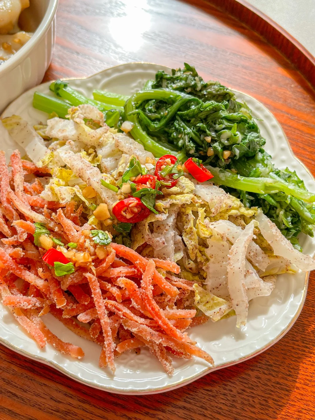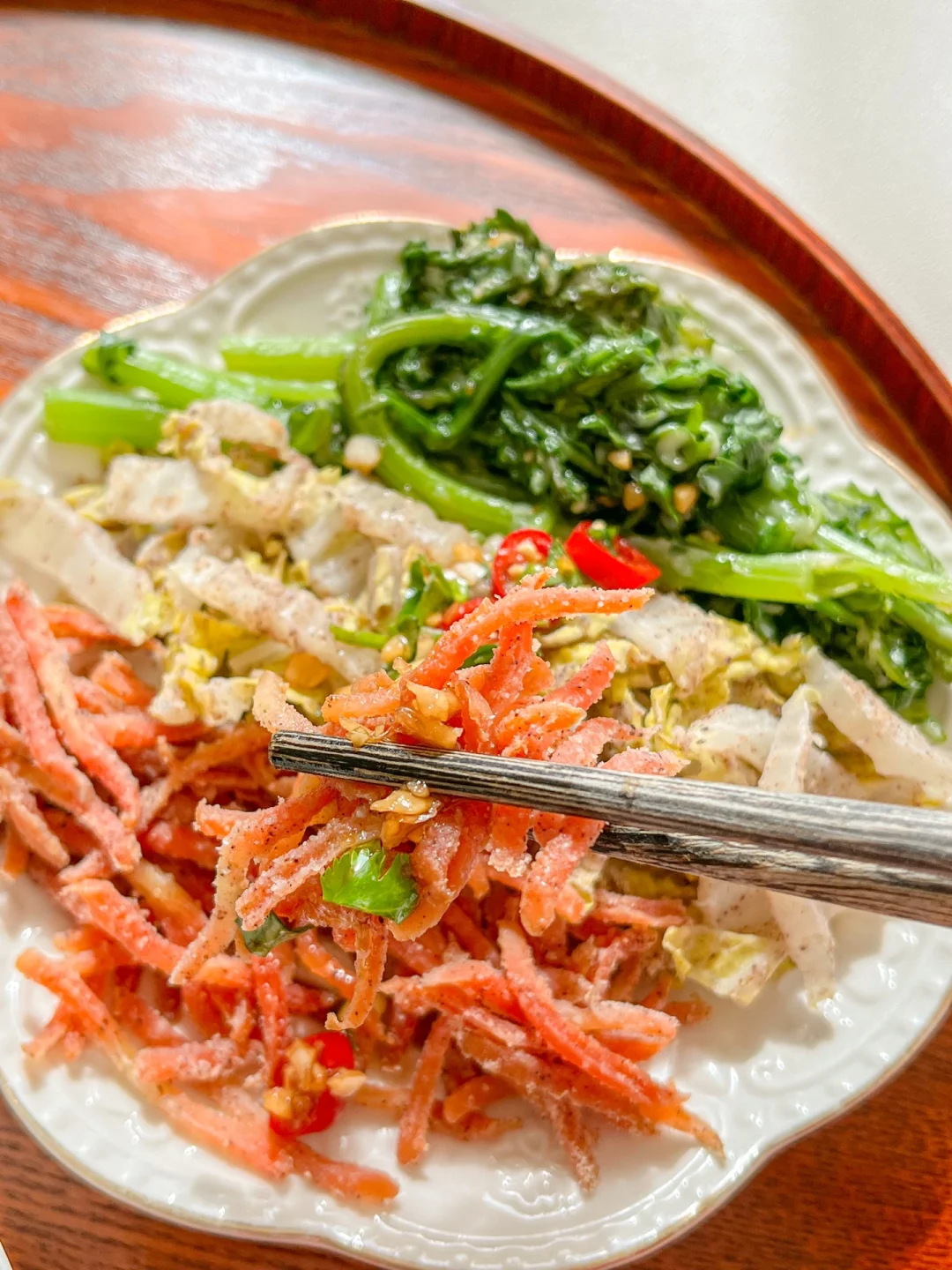 冰箱翻了三种蔬菜来做:茼蒿、娃娃菜、胡萝卜