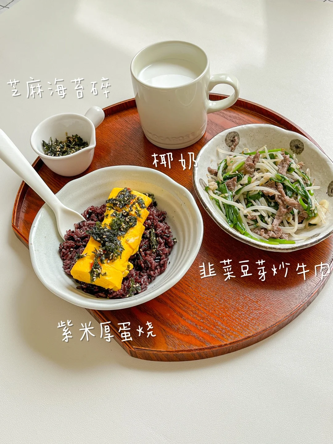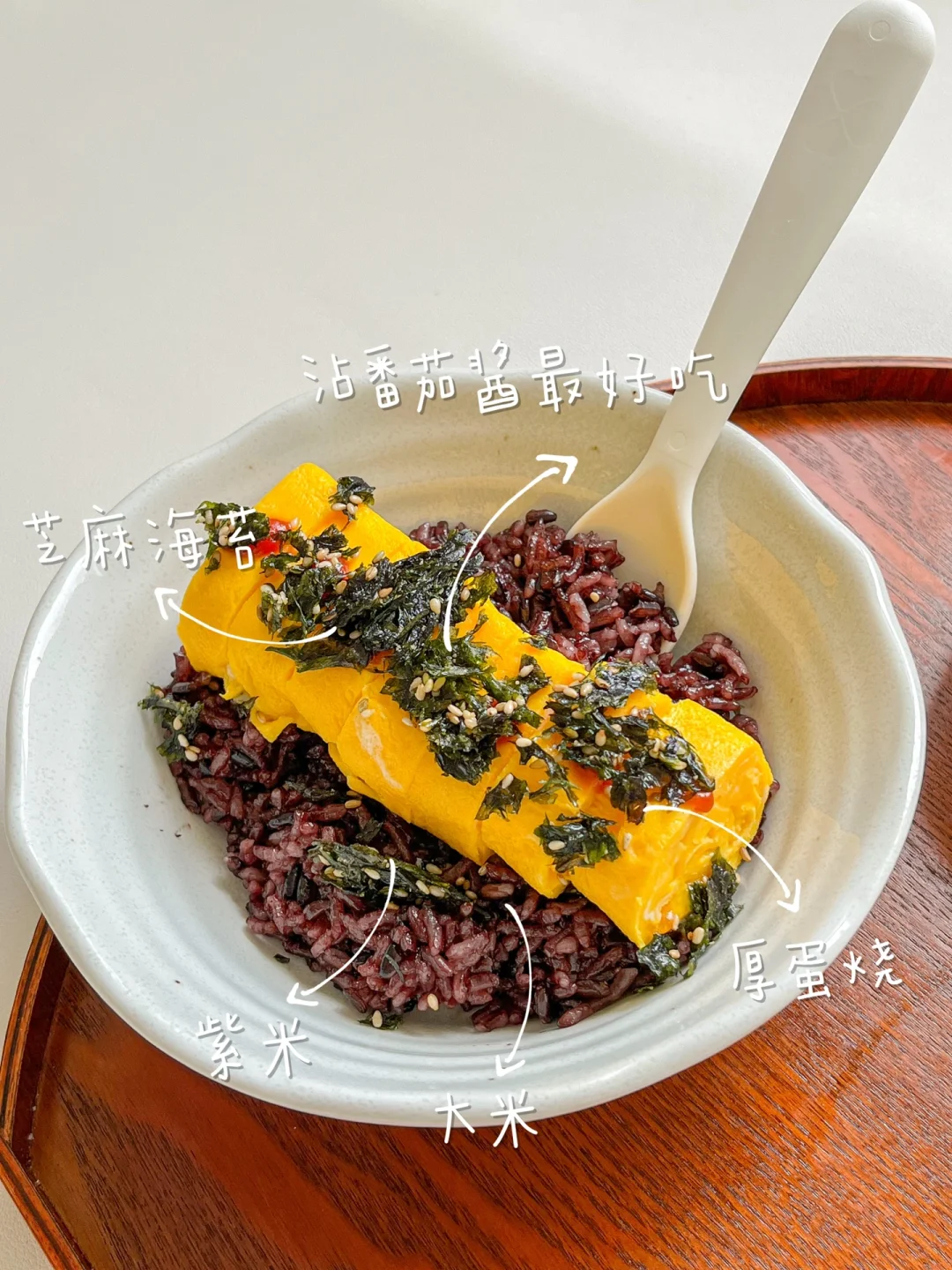 今天换换口味不吃藜麦饭了,换紫米杂粮饭,紫米煮出来饱腹感很强,还有满满的花青素而且升糖指数比较低,减脂期可以放心吃。厚蛋烧也很好做,多练习就能做的很好,做出来最好看的就是三颗鸡蛋~