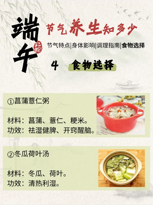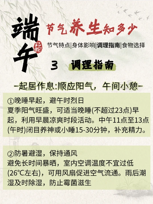 五月五,端午至🌾 湿热交织的仲夏时节,身体也悄悄进入「换季模式」——易乏、易燥、易积湿!💦 这个节气既是毒月「排浊黄金期」,也是养阳关键时~ ✨ 三大调理重点: ✅ 祛湿排毒 | ✅ 护心养阳 | ✅ 防暑滋阴 从起居作息到饮食宜忌,一篇帮你抓住端午养生精髓,吃对、喝对、调对,轻松度过湿热天!🍵🌿