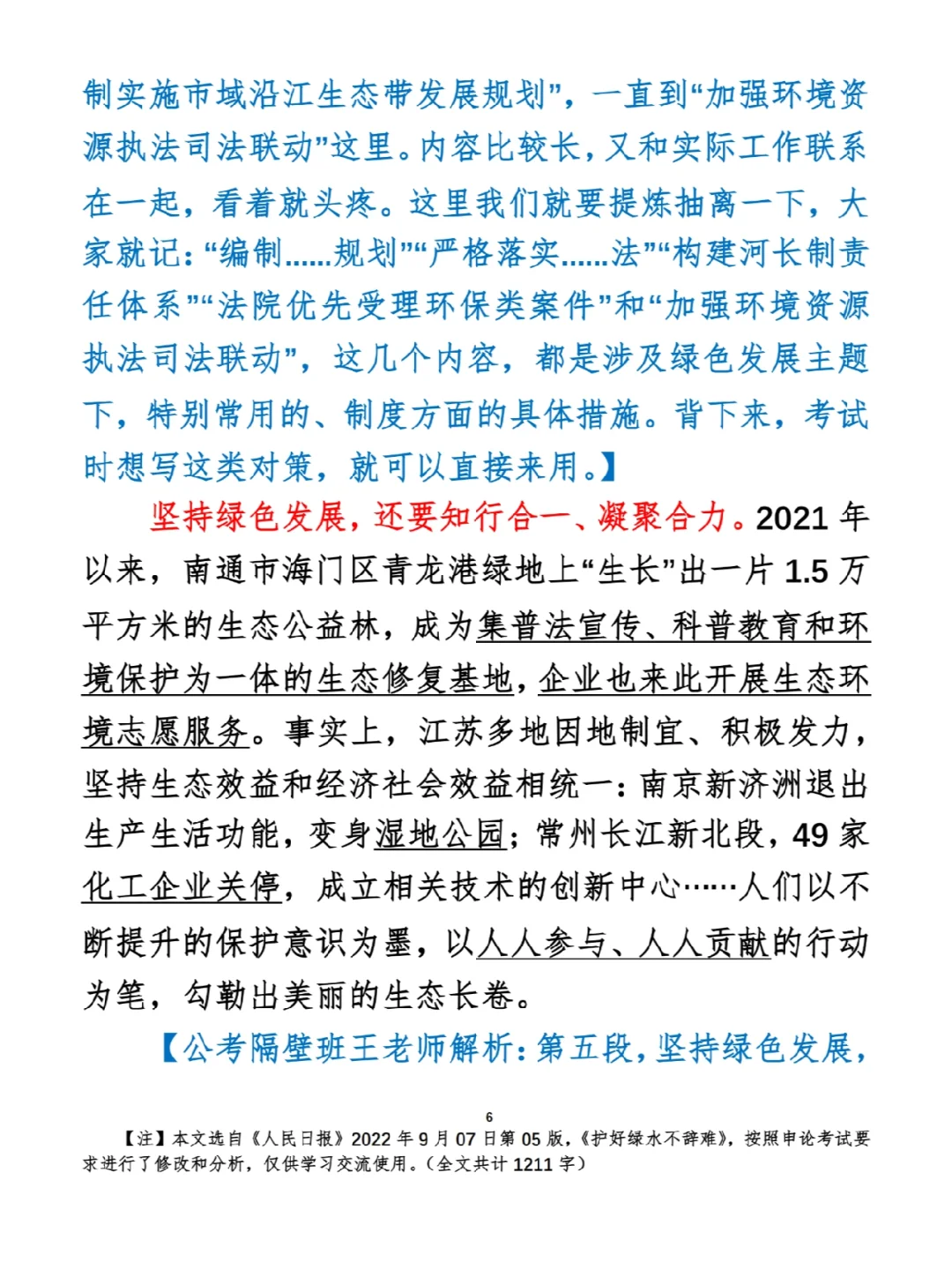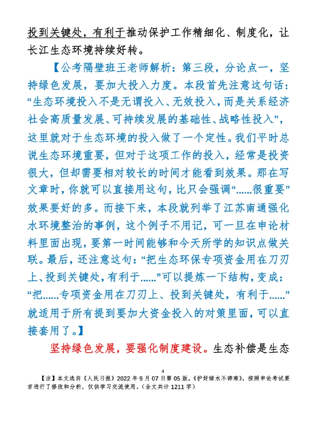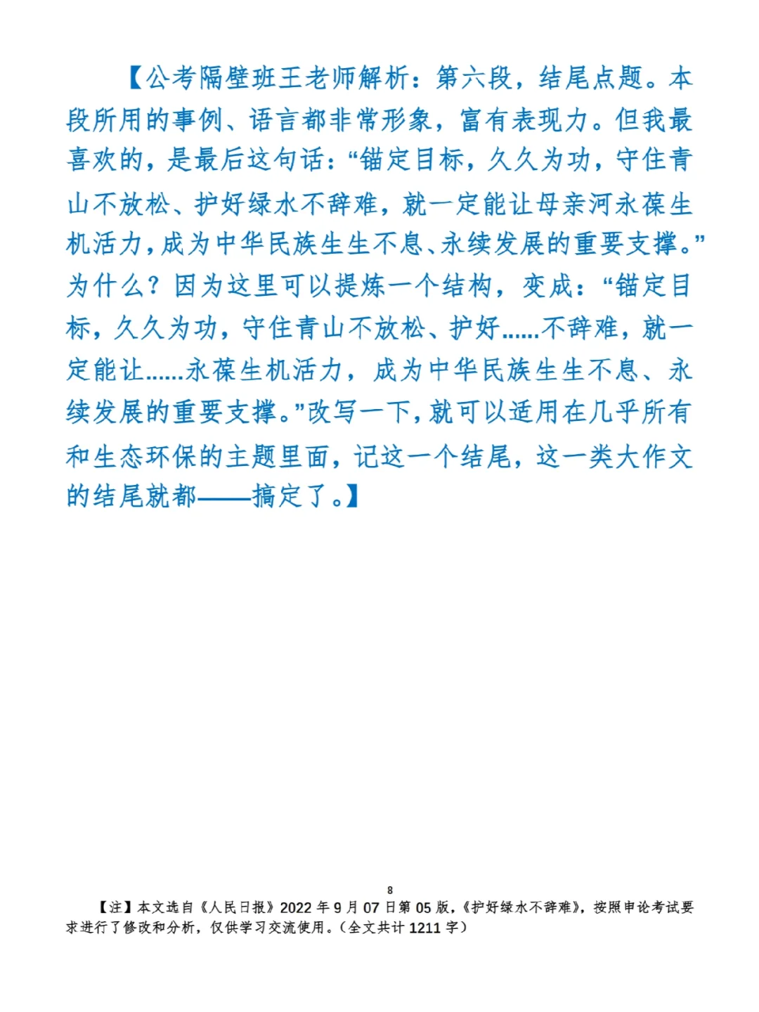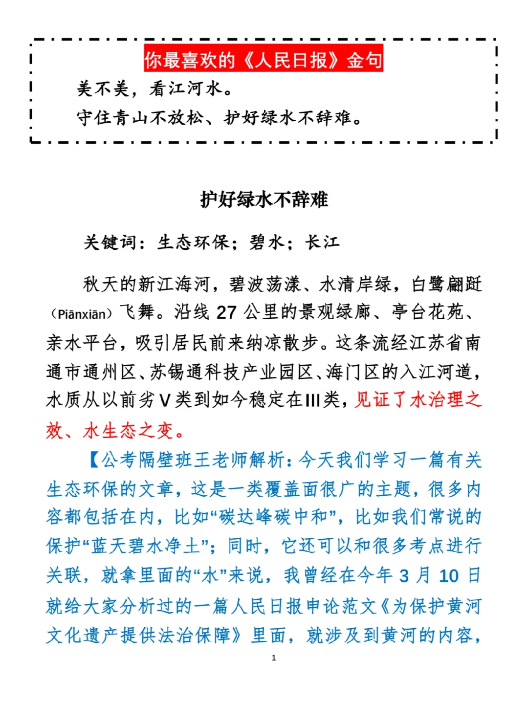 今日打卡作业: 1. 选一句你最喜欢的金句 2. 抄写全文红字+划线部分内容 3. 写完后在留言区打卡 ⭐️ ⭐️ ⭐️ ⭐️ ⭐️ ⭐️ 如何抄写:每天的抄写文章以图片形式发在“公考隔壁班王老师”账号,红色字是重点句和结构句,黑色字是正文,蓝色字是解析,大家抄写时不必抄蓝色字。建议先通读全文(包括蓝色解析部分),做到心中有数再开始抄写,效果会更好。 关于文章:抄写文章来源于人民日报,但每篇文章我都根据申论考试要求进行了修改,主要集中在四个方面:一是重写或修改开头、结尾;二是统一段首句句式结构;三是调整段落字数,使文章结构更均衡;四是简化复杂长难句,使之更具可模仿性。每篇文章修改幅度不同,无论修改多少,都是基于申论考试要求,毫无对人民日报文章品评之意。(此处致敬人民日报) 关于解析:我会在文章每段后面加一段蓝色字的解析,是我自己在抄写时的感悟,篇幅时间有限,不能面面俱到,但求重点突出。如果你有其他感悟,也希望能在评论里分享,我们相互学习、共同进步。 ⭐️ ⭐️ ⭐️ ⭐️ ⭐️ ⭐️ 这里是公考隔壁班王老师独创的“每天半小时・申论80分”抄写团,欢迎加入我们!