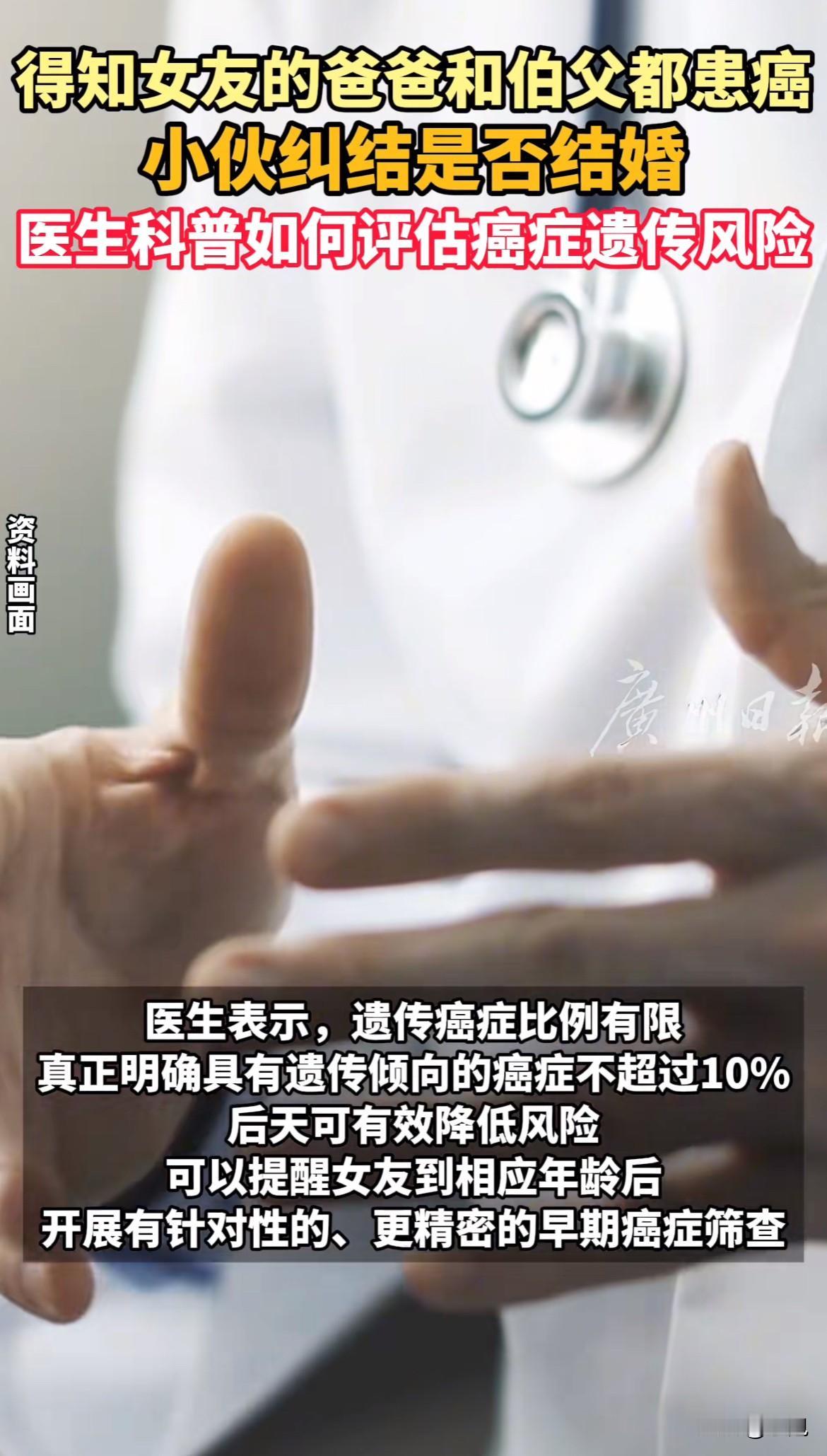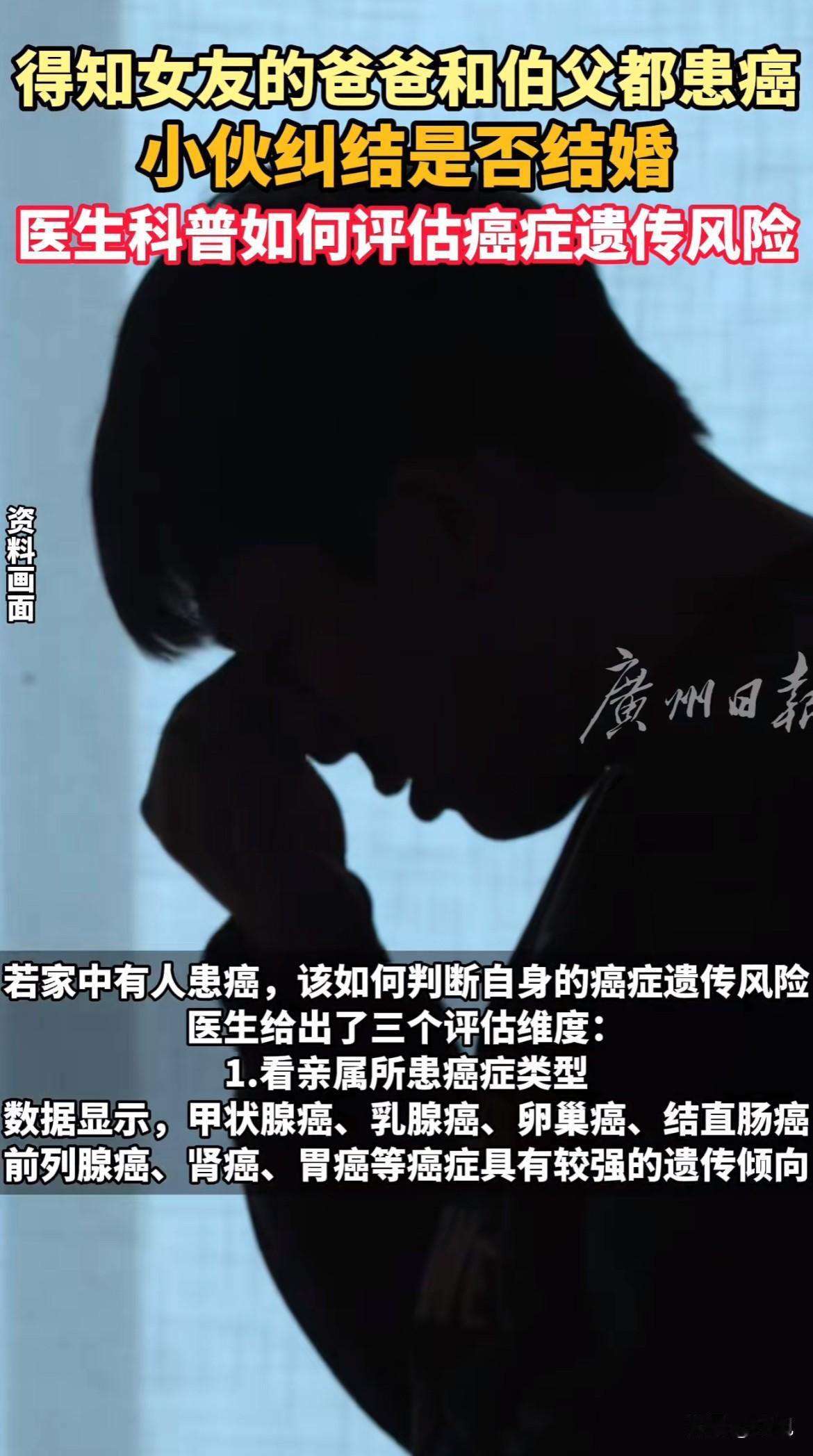 一个小伙跑去问医生:我女朋友家里有两个人得了癌症,我该不该和她结婚? 他担心两个问题:女朋友未来会不会得癌?万一结婚了,孩子会不会遗传? 医生给了三个判断遗传风险的参考维度:血缘越近风险越高;家族里得癌的人越多风险越高;得癌的年龄越轻风险越高。 这让人想起安吉丽娜·朱莉。她就是因为检测出有高风险基因,选择了预防性切除手术。 结婚前得知这样的信息,心里打鼓很正常。毕竟谁都希望未来的生活少一些风雨。但风险这件事,人生里到处都是,似乎又无法完全用指标去衡量和选择。