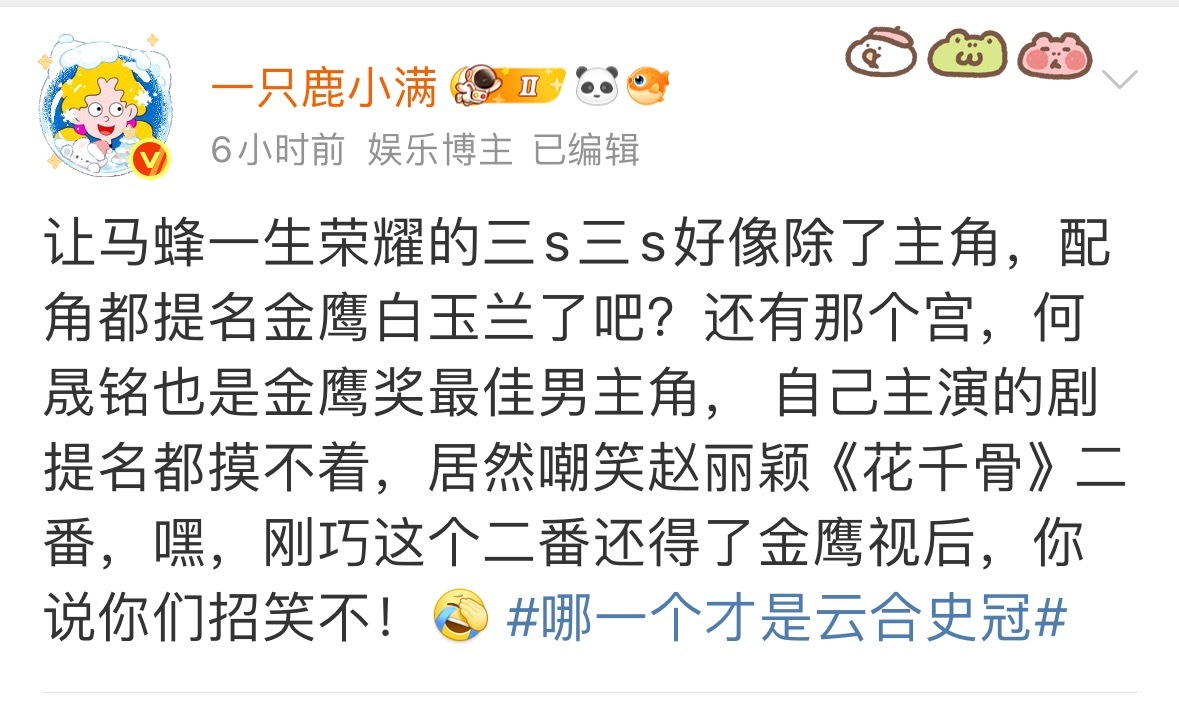 我又想起之前这个了,麻风姐姐的剧配角都获奖,(女主除外)而赵丽颖的剧主角总获奖,哈哈哈,那确实挺招恨的,赵丽颖没有当奶妈的义务,接赵丽颖部部都获奖,谢谢!