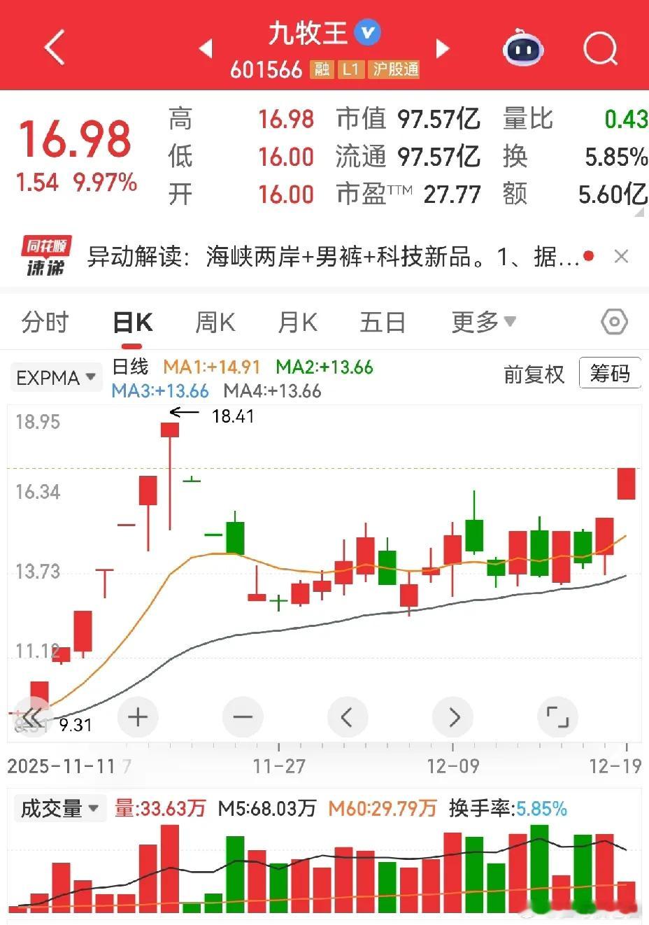雪人集团VS九牧王。雪人集团,周五的跳空高开涨停板,看上去是极强势的涨停,这种形态如果出现在底部,是比较好的,说明主力想甩开散户,不想让散户拿到低位筹码。或者是有比较大的消息,主力不再低调,直接进入拉升阶段。但是看看现在的位置,我有点疑惑。12月16日换手率55%,如此大换手率,而且后面几天回调都没有明显缩量,周五继续放量,这里什么人走了,什么进了呢?现在量化横行,有些量能已经失真,周一如果再缩量回调,也不是不可能出现的事,真正的拉升也应该缩量才好。九牧王,前面有个一波比较大的涨幅,近几天出现三阳夹两阴,且是三个涨停板的三阳夹两阴,说明比较活跃,周五涨停突破,是个信号。特别提醒:贴图欣赏,并非推荐,据此操作,风险自担。✦✦✦本人仅此一号,无微信群,无公众号,不主动加人,主动加人者是骗子。请提高警惕,否则损失自负。✦✦✦