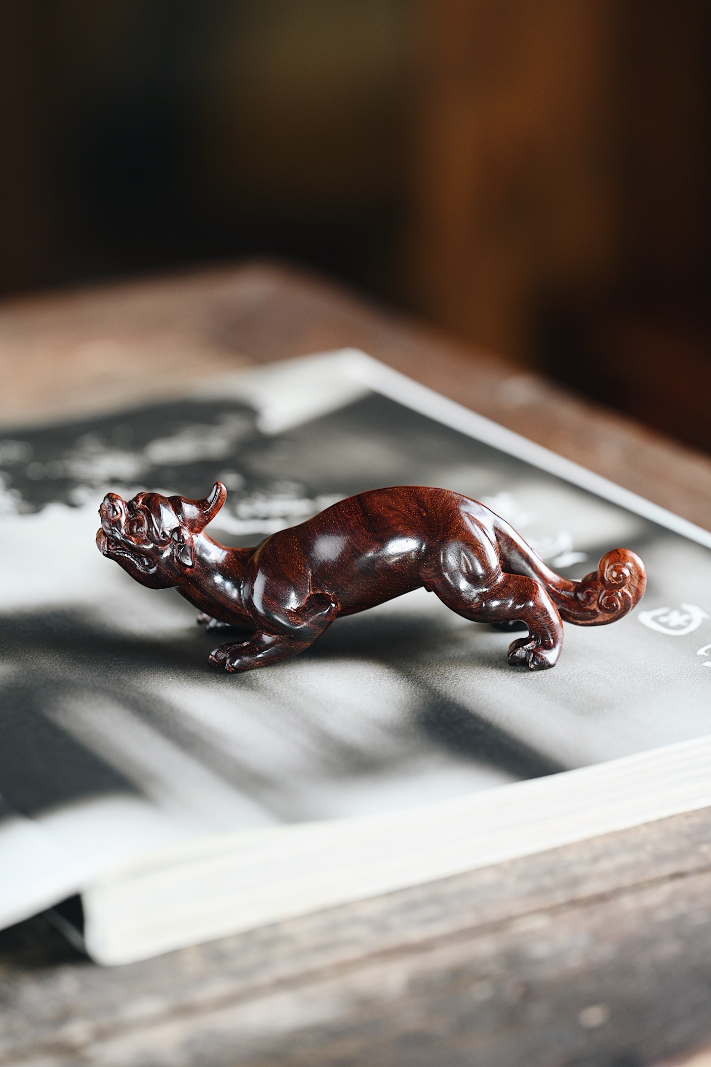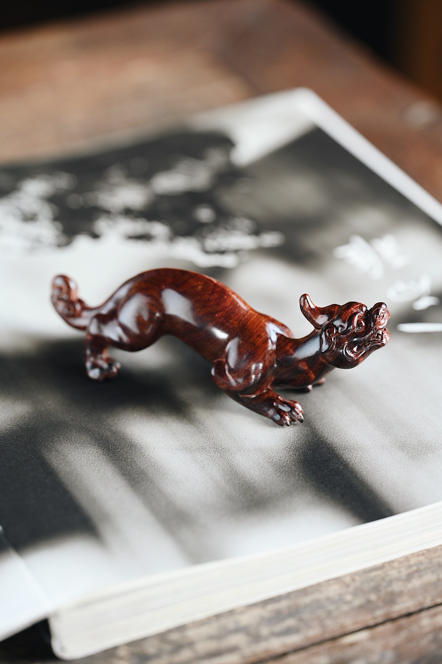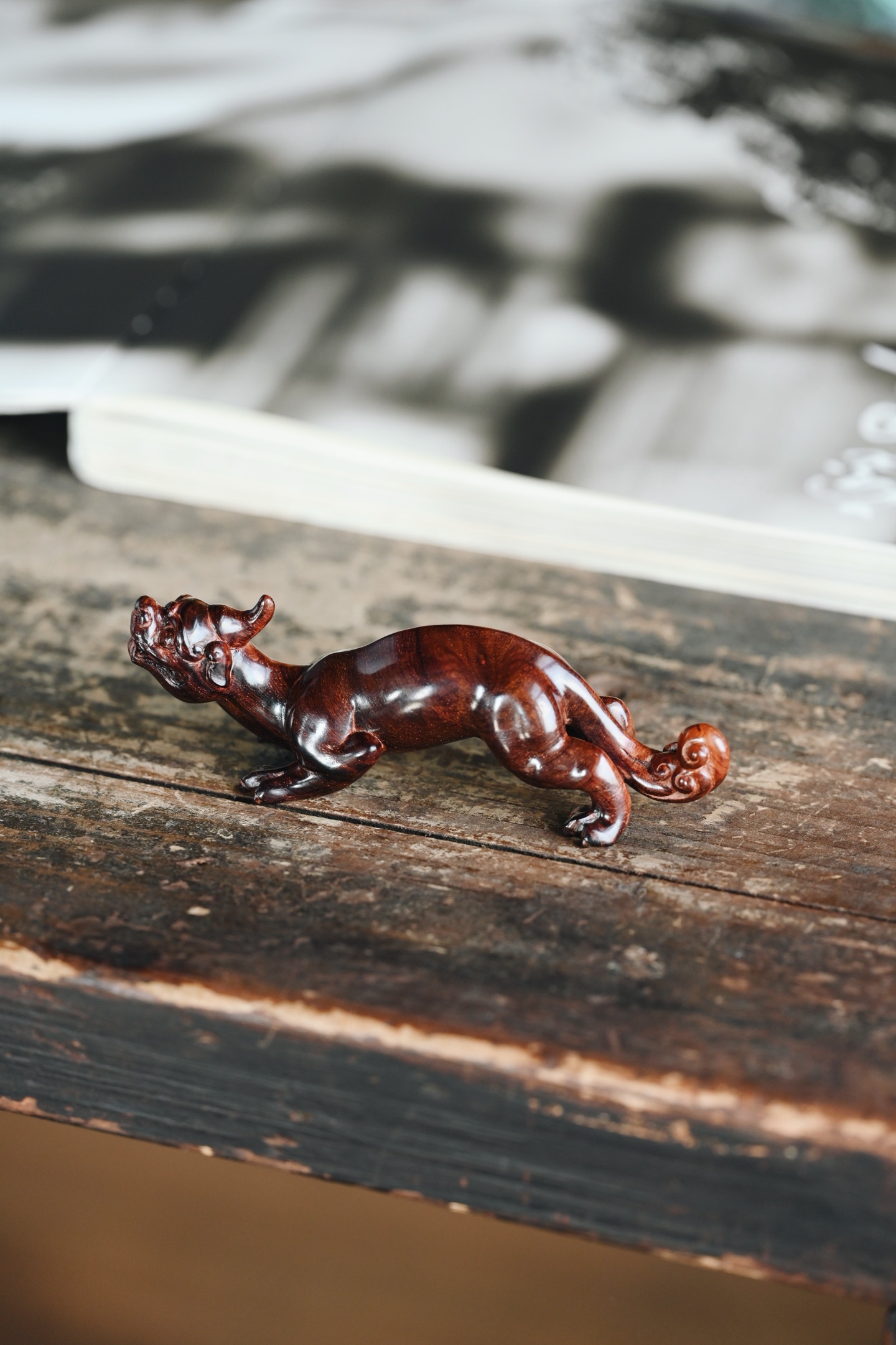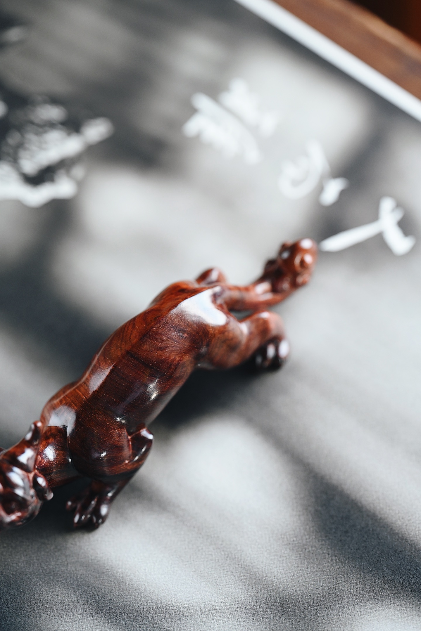 黄花梨 | 螭龙紫油梨,料质细腻,螭龙身形矫健,游宛欲行,圆首阔口,双目炯炯有神,线条流畅自然,形态生动,造型古拙,置文房陈设,意趣盎然。11.5*3.2*4cm 33g