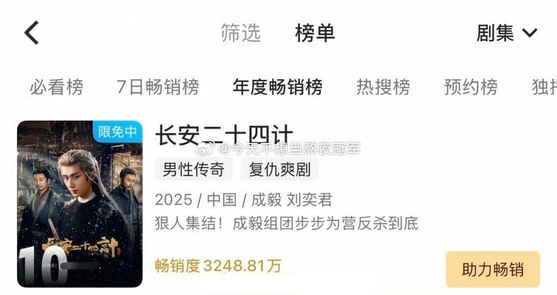 成毅《长安二十四计》开播第10天,已进入年榜前10。今天灯塔涨幅比昨天还猛,今天