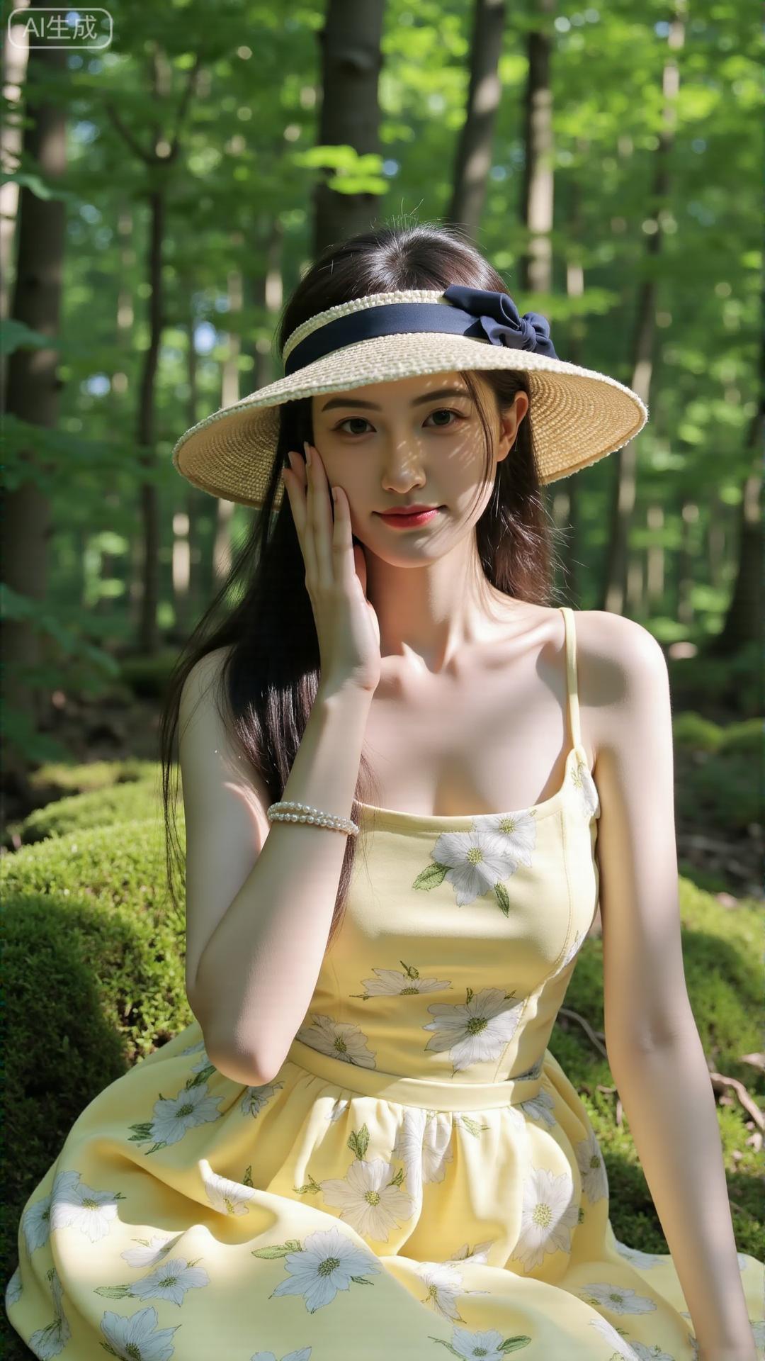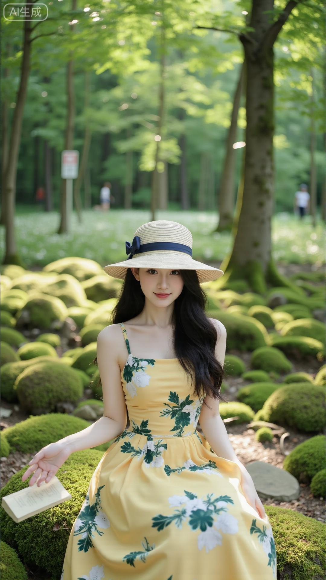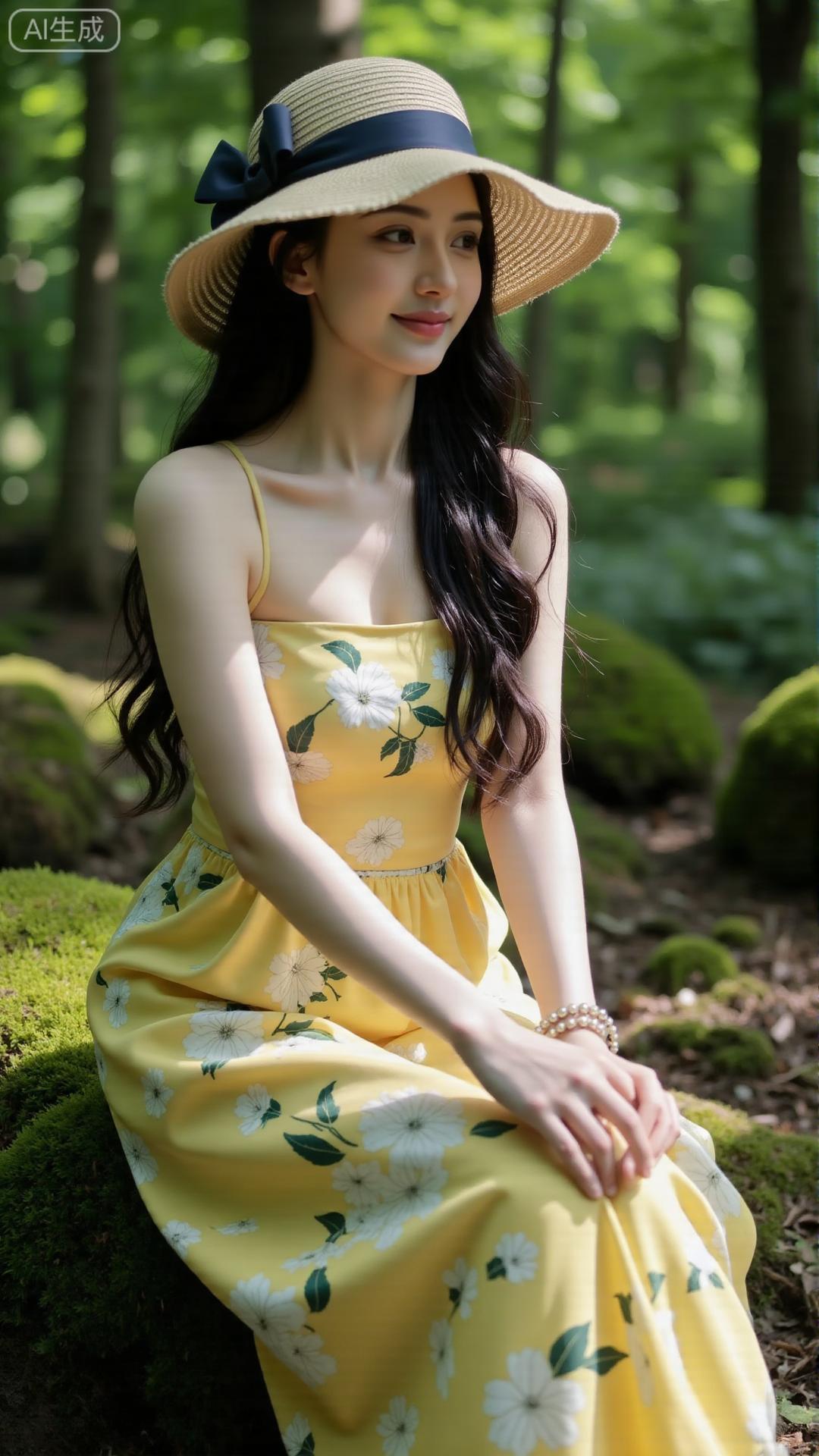 林隙漏下的光,裹了黄裙的花甜,草帽檐晃过苔藓的软。连风都浸着森野的柔。 森系花裙