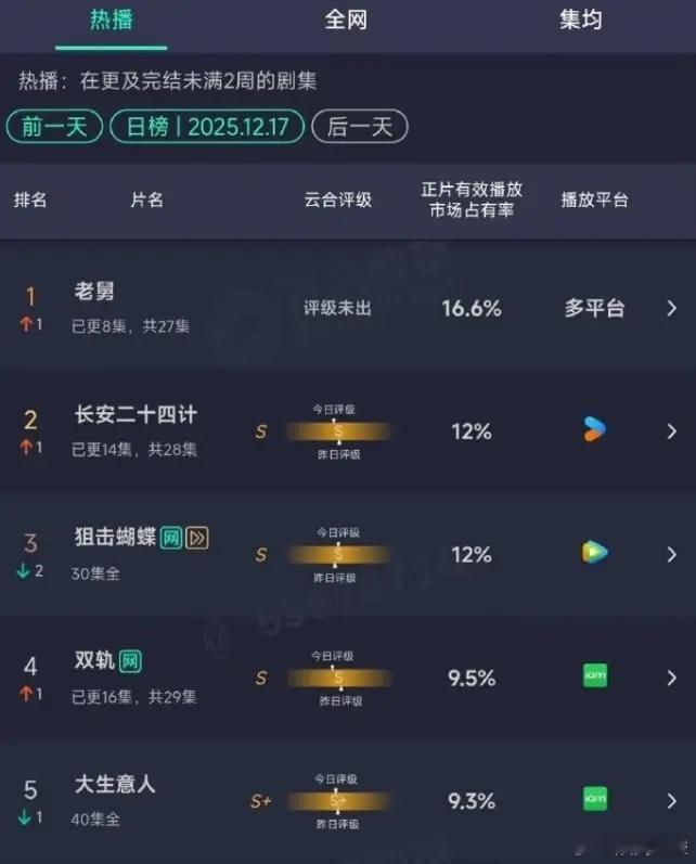《老舅》太强了云合已登顶!郭京飞的《老舅》力压成毅的《长安二十四计》云合登顶,开播第三天云合占比已经到16.6%,最近开播的几部剧都没这么快速度登顶,但毕竟不是流量明星的剧,却双平台分流,所以热度上比较吃亏,爱奇艺热度刚破7000,腾讯热度刚破25000,现在郭京飞已经被夸赞观众缘太顶了。