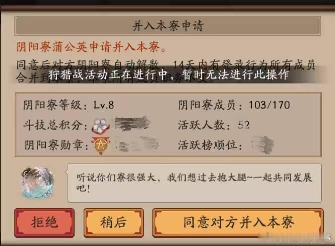 “投稿,我是会长,已经和另一个寮商量好了并过去合寮。结果正好赶上雪女活动,等了一个星期,怕人数太多已经踢掉了长期未登录但不满14天的人,结果还是提示人数太多。对方也在清人。仔细数过:对方活跃100多人,我寮活跃人数50多,合寮后自动筛除离线14天以上,170的人数上限绝对是够的,但还是提示人数太多。可以,我们自己踢。离线30以上的人我每天10个的踢下去,期间一直在尝试申请合寮。不是提示人数太多,就是提示麒麟寮活动合不了。但是今天再次合并,对方105人,我寮53人。凌晨00:20没有任何寮活动开启,仍然提示阴阳寮活动开不了?!!我手撕zen的叠!🐶zen现在这个时间段是什么寮活动能开着让人不能合寮?这个亖麒麟开一次几乎占了一整天,让正常的阴阳寮合寮进行不下去这甜蜜的合理吗?为什么合寮时标注的自动剔除14天以上的离线人员不生效?在活跃人数达标的情况下提示人数太多?乌乌,不好意思脾气暴躁,但是zen不骂不行,为了合寮折腾了半个月,我和对面都受够了,请帮忙反馈一下这个合寮问题。”