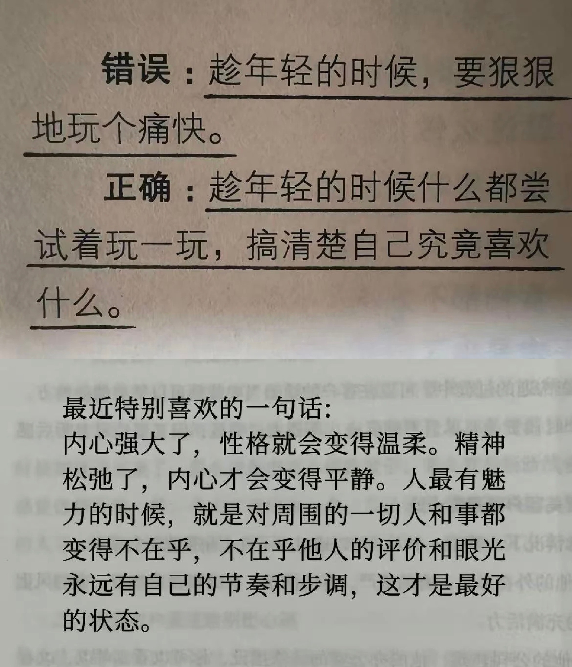 人确实抓不住任何东西,但有时候相信永远比永远本身更会让人幸福,趁年轻的时候什么都要尝试下,搞清楚自己究竟喜欢什么,人生的容错率远比你想象的大。所以,随便做点什么吧,给命运的齿轮一点转动的机会。满谈语录内心强大了,性格就会变得温柔;精神松弛了,内心才会变得平静。人最有魅力的时候,就是对周围的一切人和事都变得不在乎,不在乎他人的评价和眼光,永远有自己的节奏和步调,这才是最好的状态。