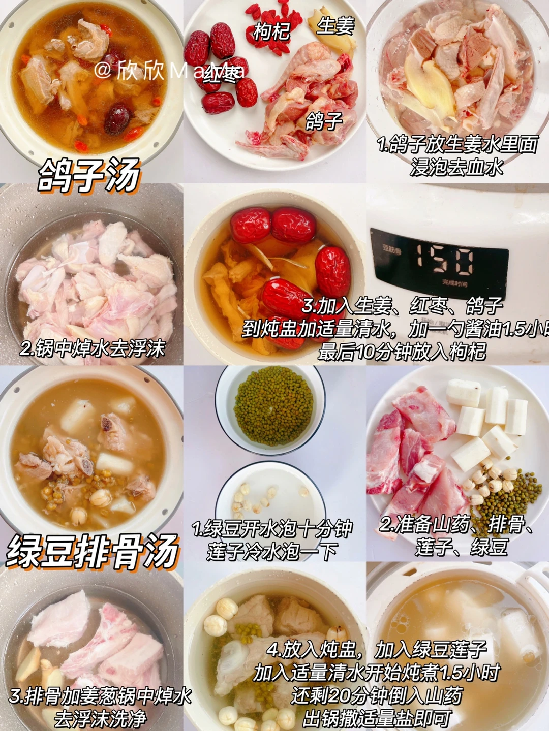 今天给大家分享9款宝宝爱喝的营养成长汤,都很适合宝宝的肠胃!做出来的汤味道鲜美,大人小孩都爱喝哦!做法简单,处理下食材,炖一炖就好啦,节约了妈妈不少时间呢! 〰️〰️ 🌈9️⃣款不重样炖汤 ✅豆腐鲫鱼汤 🛒食材:鲫鱼、葱、豆腐、鸡蛋、菌菇 . ✅裙带菜排骨汤 🛒食材:玉米、胡萝卜、排骨、山药、裙带菜 · ✅番茄排骨汤 🛒食材:番茄、土豆、排骨 . ✅冬瓜猪骨汤 🛒食材:猪骨、冬瓜 . ✅香菇炖鸡汤 🛒食材:香菇、鸡肉、山药 . ✅莲藕猪骨汤 🛒食材:香菇、胡萝卜、猪骨、莲藕 . ✅黄豆猪脚汤 🛒食材:猪脚、黄豆 . ✅鸽子汤 🛒食材:红枣、枸杞、鸽子、生姜 . ✅绿豆排骨汤 🛒食材:绿豆、排骨、山药、莲子 . 🔍具体做法请看图2-图9 煮好后根据自己口味盐淡及爱好加盐等调料,一岁以下不加调料味 有疑问🤔️也可以评论区留言喔😄 💡关注我带您解锁更多辅食制作