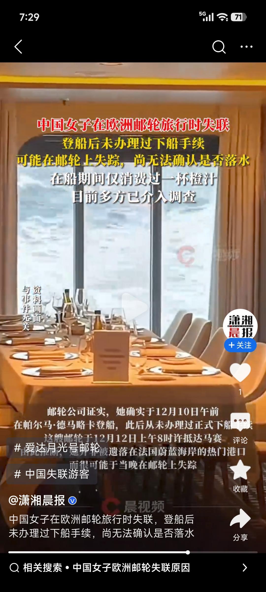 最近听说中国一女性在欧洲邮轮上失踪,这事儿听起来就挺让人揪心的。想象下在茫茫大海的邮轮上,人说没就没了,这背后不知道发生了啥。欧洲邮轮航线长、游客多又复杂,要找到线索难度不小。或许是意外,也有可能存在其他隐情。这也给喜欢坐邮轮旅行的人提了个醒,哪怕在看似安全的邮轮上,也得时刻注意自身安全。希望相关部门能尽快查明真相,让失踪女性早日有个下落,也给她的家人一个交代。
