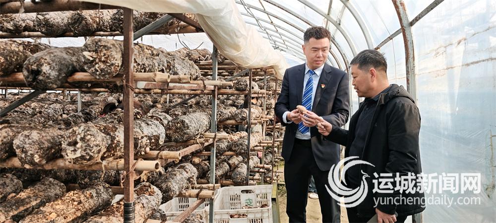 建设银行万荣支行工作人员在万荣一香菇种植棚回访。记者陈永年摄