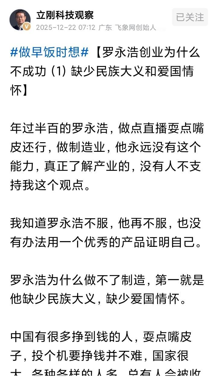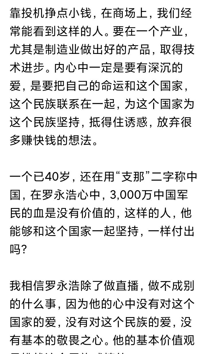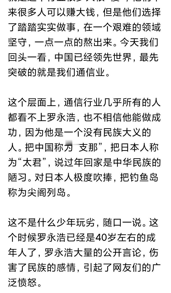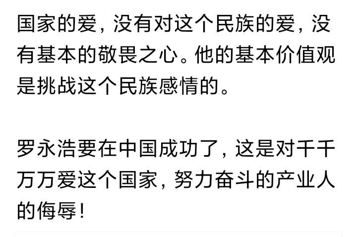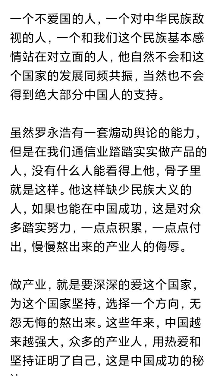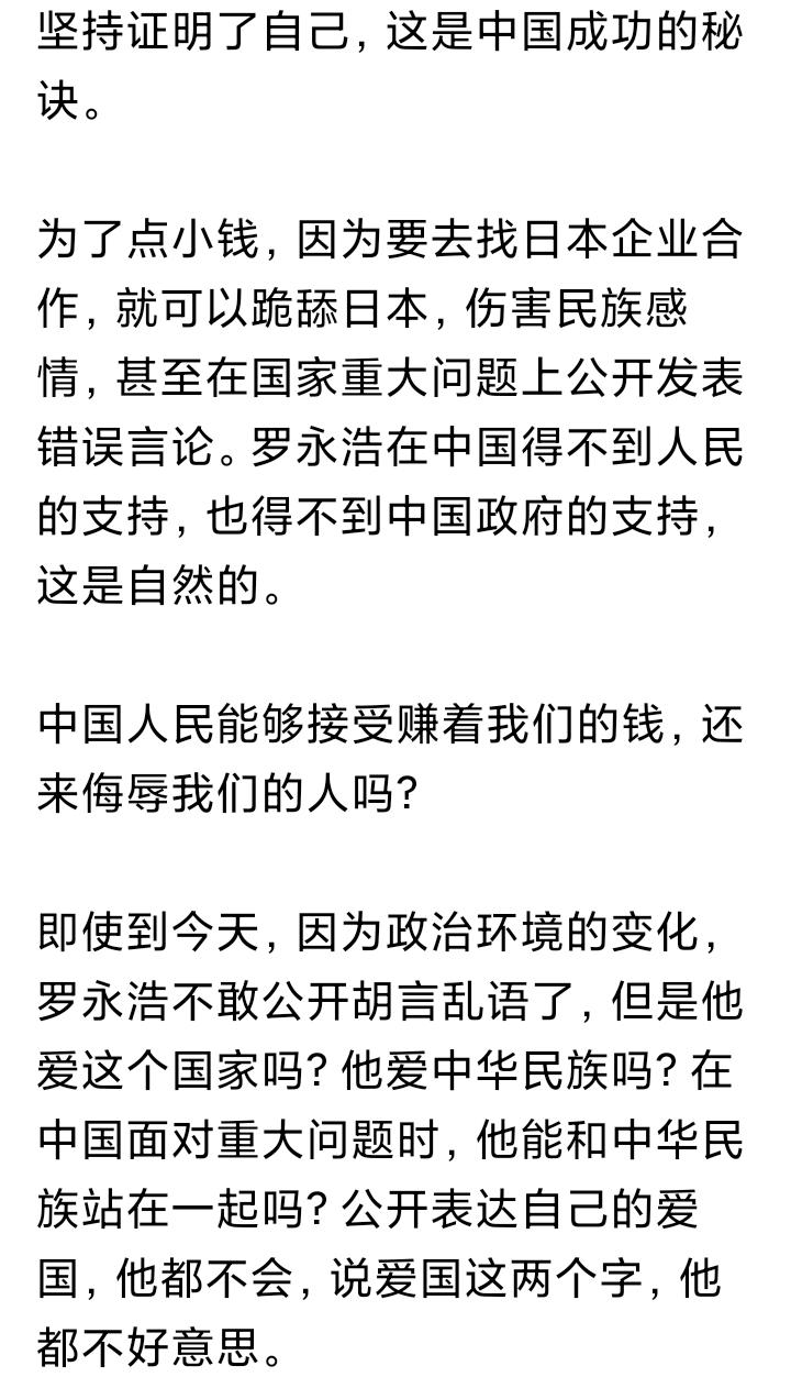 项立刚今天天早上,终于拿出了大杀器,他的这篇文章,是一篇战斗的檄文, 在中日关系恶化的时候发表,这是要罗永浩的老命了, 他的意思只有一点:不爱国的人,做不成产业, 项立刚说的非常对,老罗确实不长眼,自己送上门来了, 当初项立刚批评他的时候,语言是很含蓄的,他非要骂人家“精神病”,还有ZZ,老项60好几的人了,怎么可能吃你的亏? 况且网络是有记忆的,十几年前,老罗就是个精日,还是个恨国党,大家爱惜他,没人提了,他自己要心里有数,作为一个有前科的人,要谨言慎行,这下好了,全完了, 项立刚公布的老罗以前的言行,真是没眼看,我都不敢发,有心人可以搜搜项立刚的头条, 现在老罗怎么办?大家都想想办法,救救他。