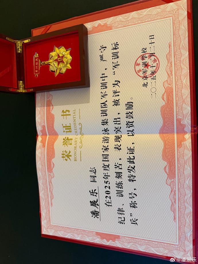 潘展乐更新社媒晒军训照,被评为军训标兵