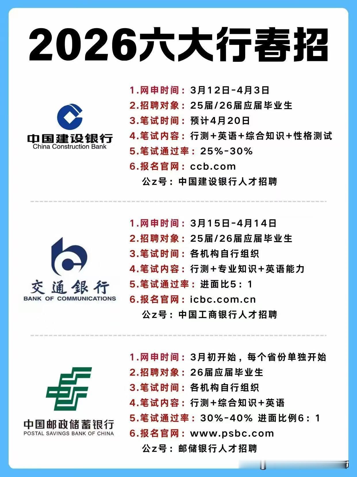 【2026六大行春招】 招聘时间:2026年六大行春招网申时间主要集中在3月上旬至4月中旬,其中中国银行最早开启报名(3月3日),邮储银行最晚截止(4月15日)。 招聘规模:2026年六大行春招规模较大,其中工商银行预计招聘约4506人,农业银行预计4530人,建设银行预计2325人,中国银行预计4691人 学历要求:普遍要求全日制本科及以上学历,部分分行偏远岗位可能放宽至专科(以具体岗位为准)。 英语要求:多数银行对英语四六级要求有所放宽,其中工商银行客服经理岗位、农业银行分行岗位、建设银行县域地区岗位、中国银行综合服务岗位均无四六级要求。 专业要求:大部分银行不限专业,但金融、经济、计算机、管理等相关专业更具优势。