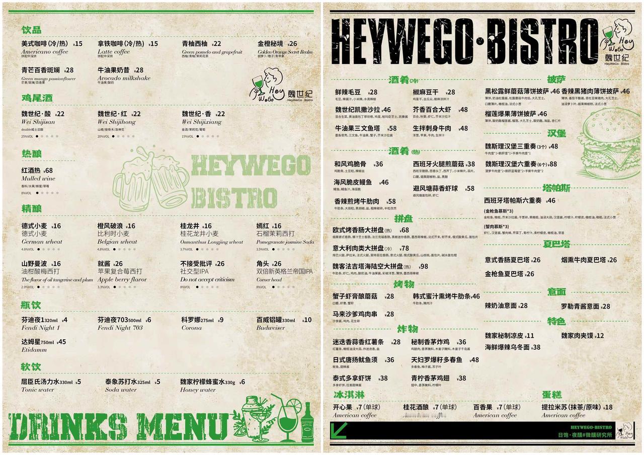 “魏家帝国”版图再延伸,这回开了一家小酒馆,名为魏世纪 HeyWeGo·Bistro,首店落位南大街粉象公园。从已曝光菜单可以看到,像是“日咖夜酒”基础款产品,其单杯价格大多介于10-30元,而在提供冷食、炸物之外,你仍能品尝到魏斯理汉堡、秘制凉皮、肉夹馍等魏家招牌主食。