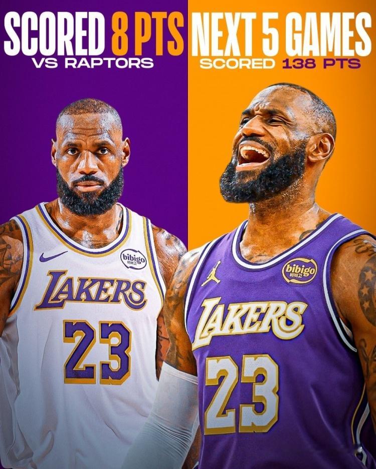 自从打猛龙得8分后,接下来的五场比赛,詹姆斯已经拿了138分,场均达到了27.6