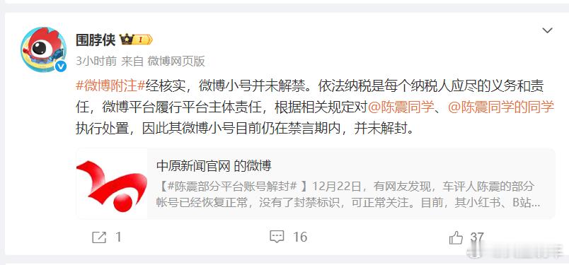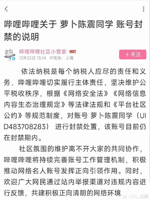 各大平台先后发布公告,陈震账号仍在封禁中,这就说明所谓陈震账号已经解封的言论为谣言。陈震的偷税漏税问题都上央视了,而且又恰逢新能源汽车自媒体乱象整治的关键时期,这么短的时间内解封概率不大,也容易引发舆论方面的反弹。目前各大平台都没有说明陈震的明确禁言时间,但是根据微博侠和B站的回应,有这样一句话,仍在封禁期内,很显然应该不是永封,解禁还需要一些时间。陈震属于汽车圈公认的最顶流大V,影响不可谓不大,但是,不管有多顶流,只要胆敢违法违规,一瞬间就会让你塌房,在法律面前,没有什么大V小V,名声再大也得守法,这是基本常识。