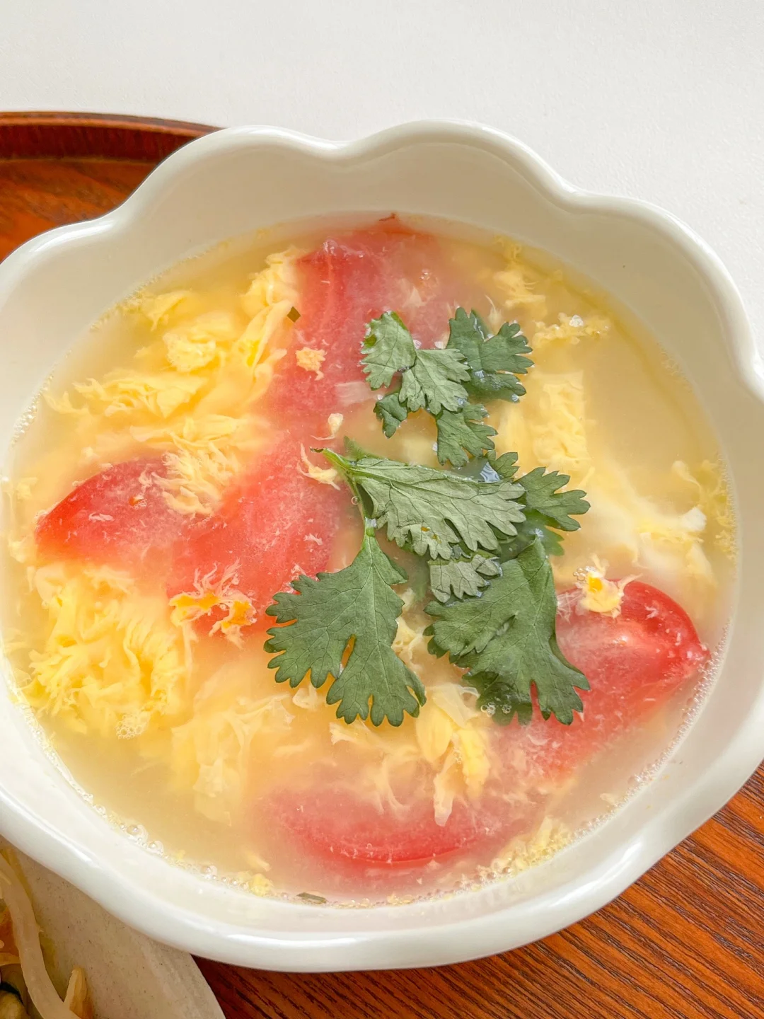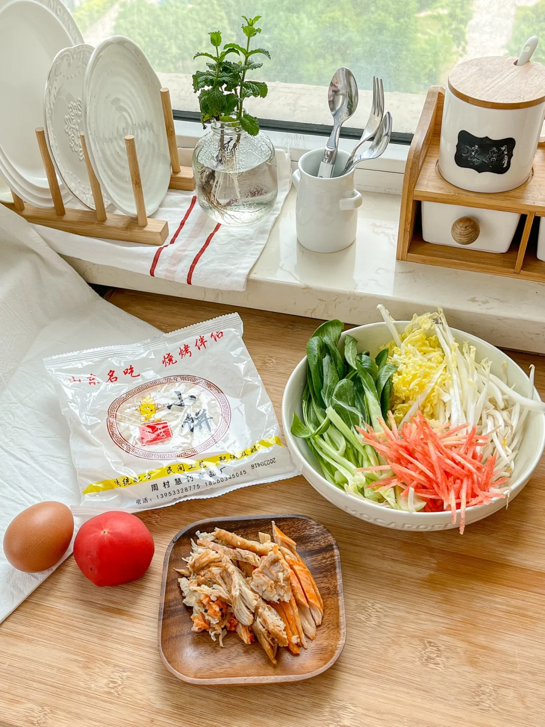 “一份蔬菜炒饼和一碗清淡的番茄鸡蛋汤,一饭一汤,花费十分钟,也是我最日常简单的午餐。”