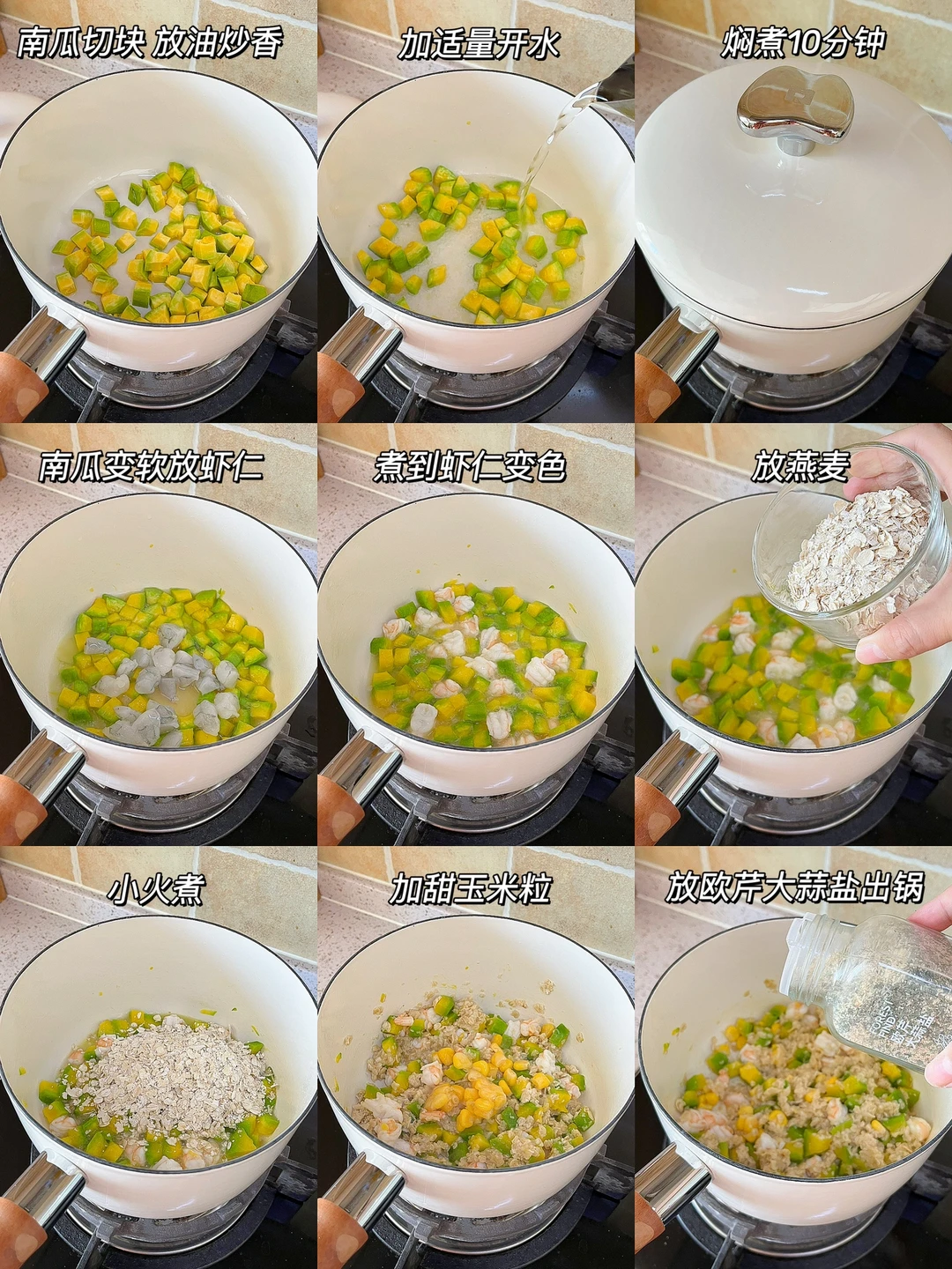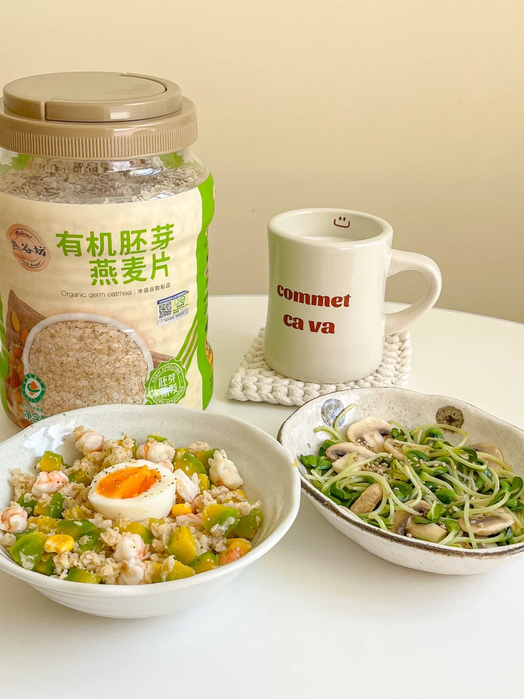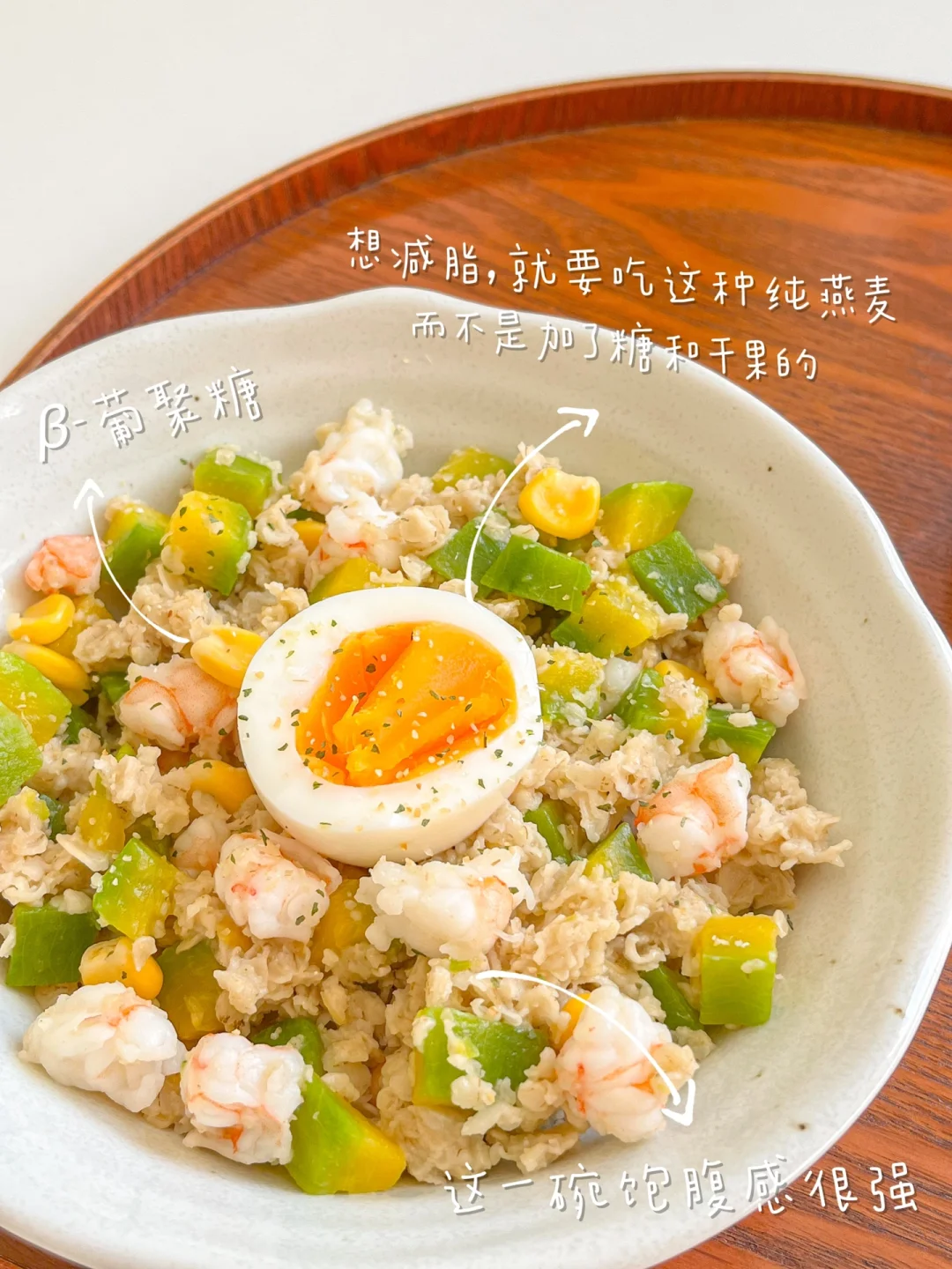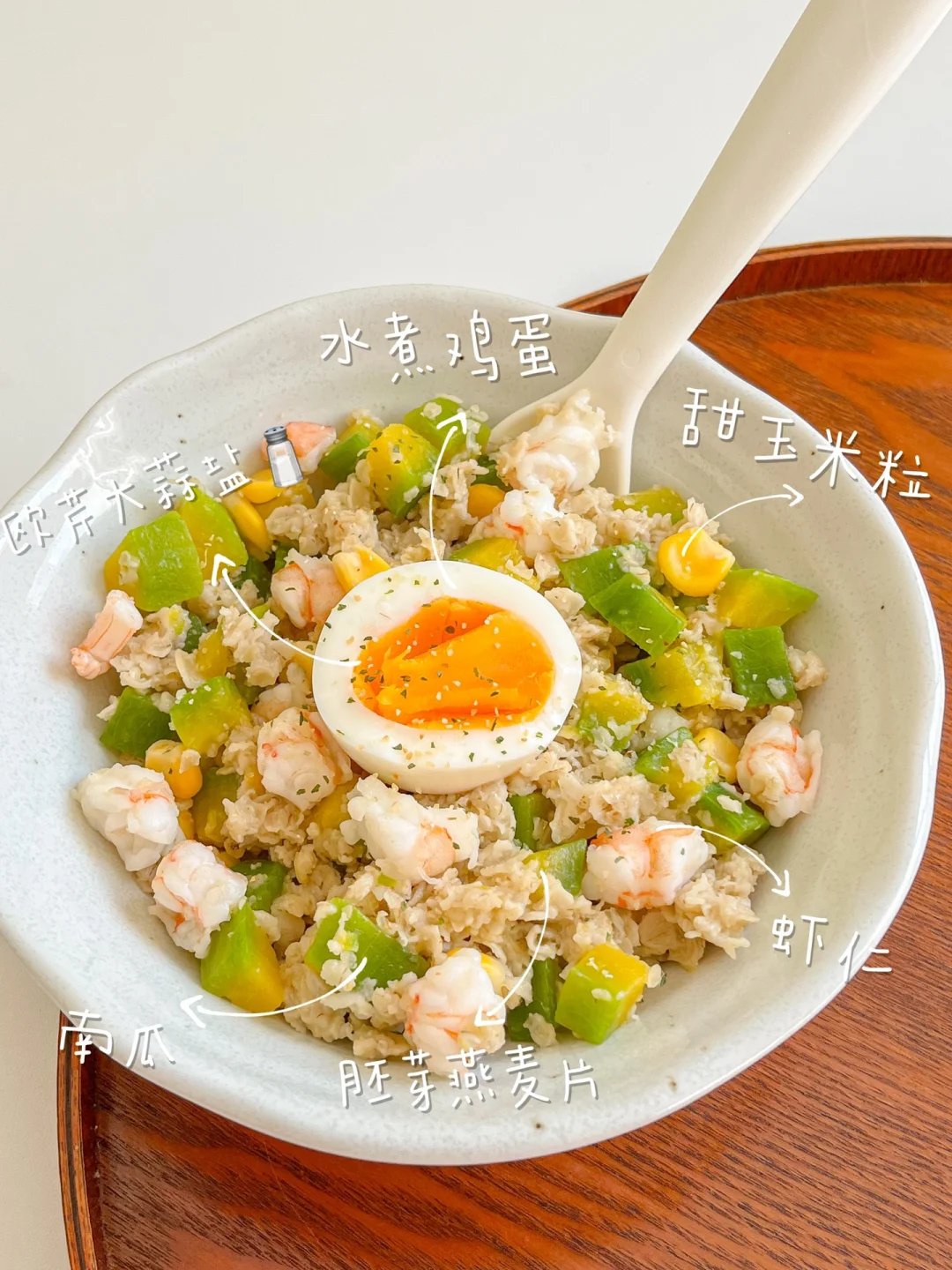 今天尝试了虾仁燕麦炒饭,我还放了南瓜和玉米粒,甜甜糯糯的很好吃!减脂期可以适量的吃点燕麦片代替米饭,属于优质碳水,饱腹感很强,蛋白质和膳食纤维丰富,当减脂餐是很不错的选择。但要注意不要吃加了甜味剂的那种,要吃原味全谷物的燕麦片。