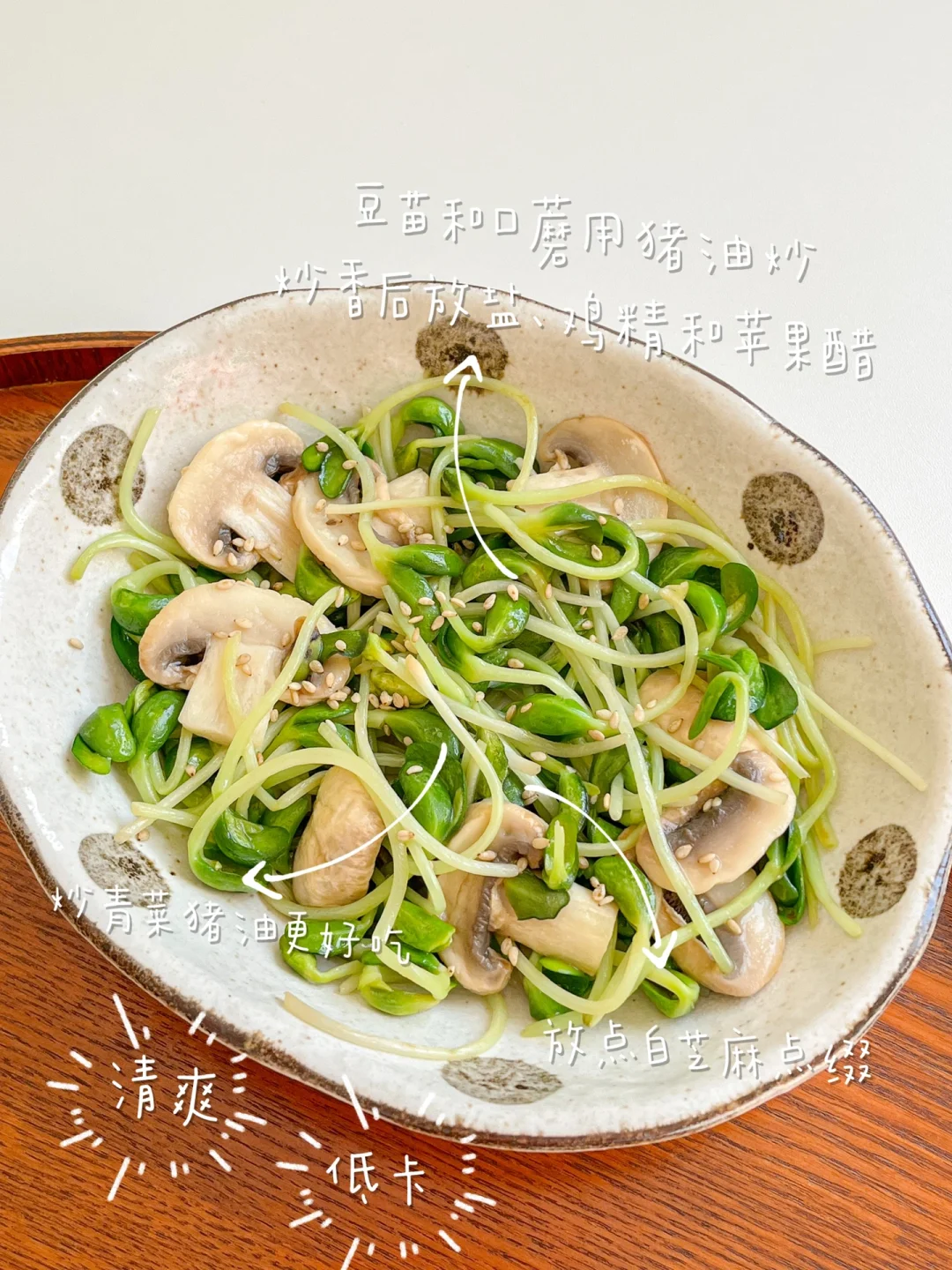 豆苗和豆芽我都很爱吃,都是很低卡的蔬菜,加点苹果醋炒很爽口。豆苗也可以凉拌吃,焯水后记得过一次凉水,颜色更更绿口感也脆。