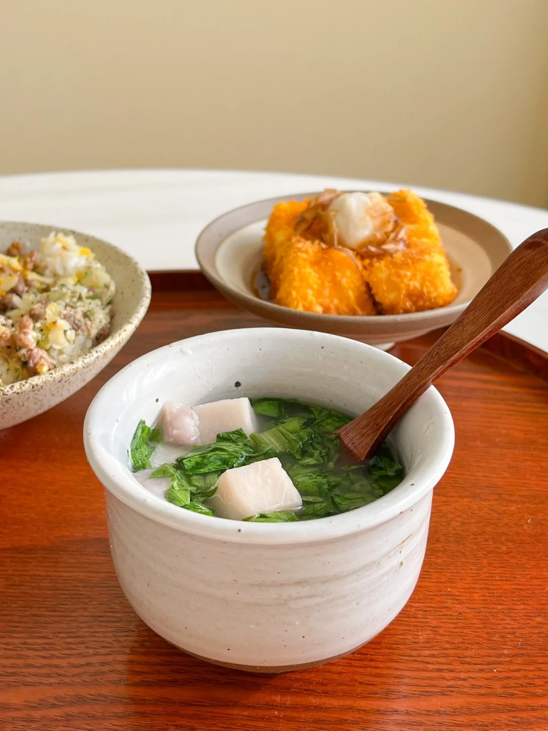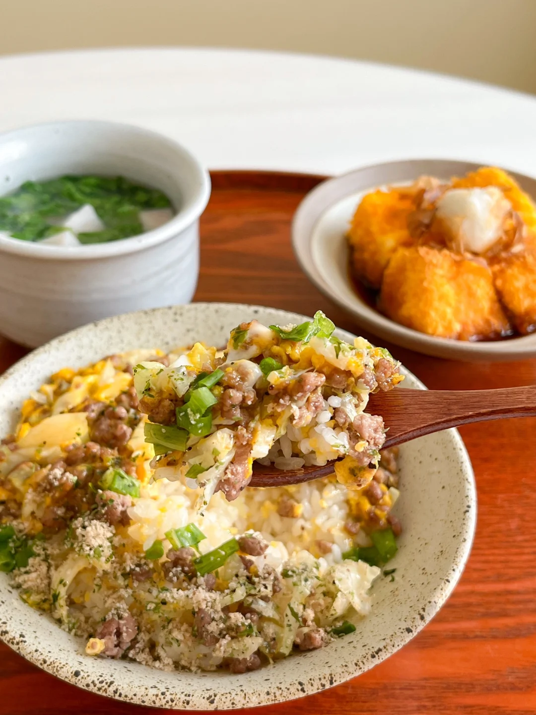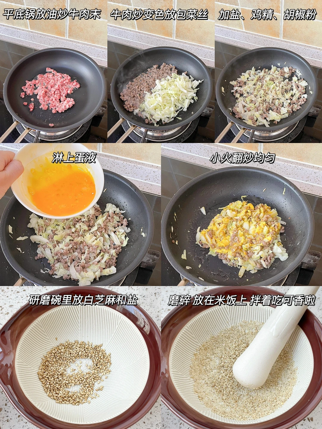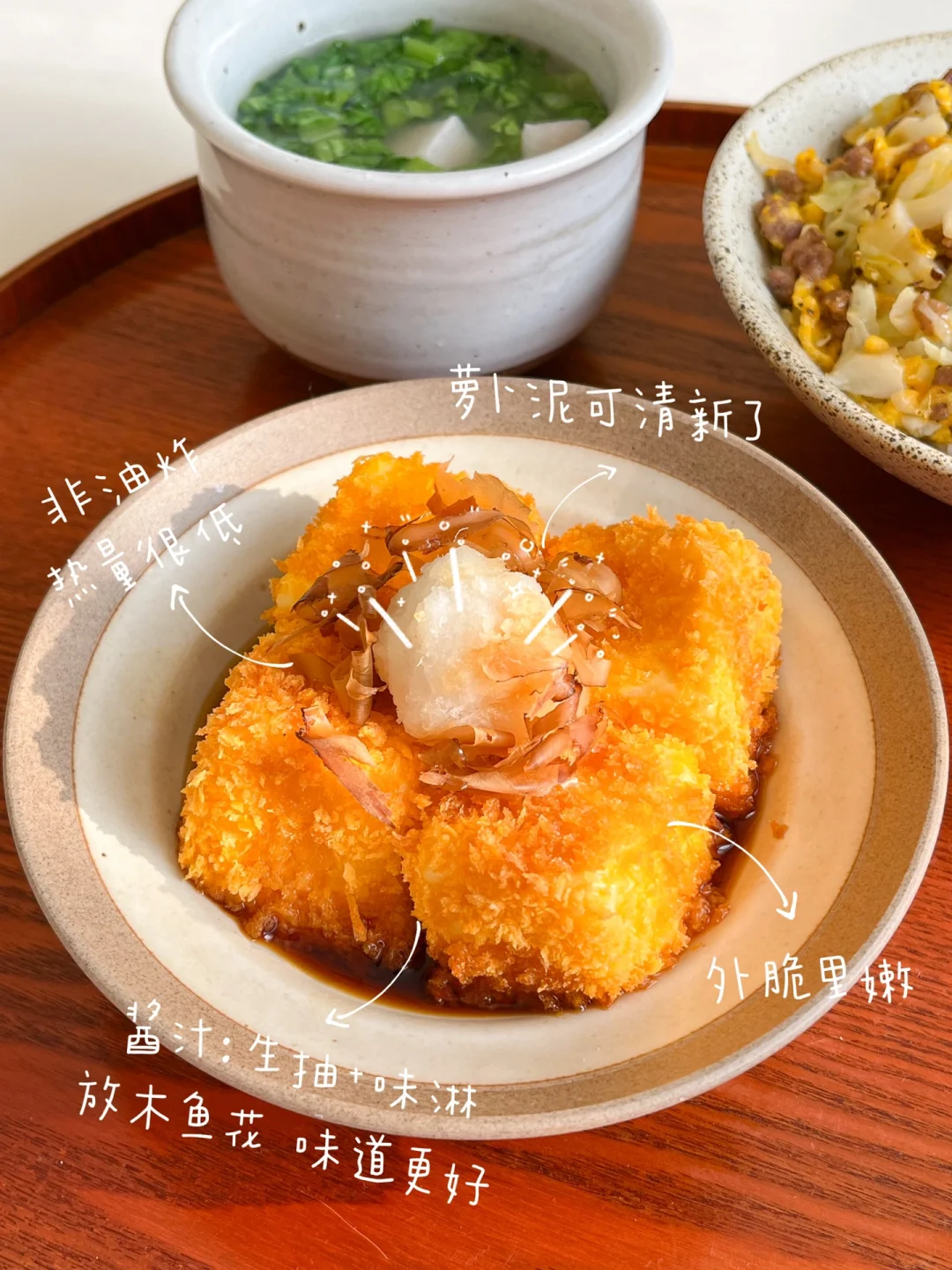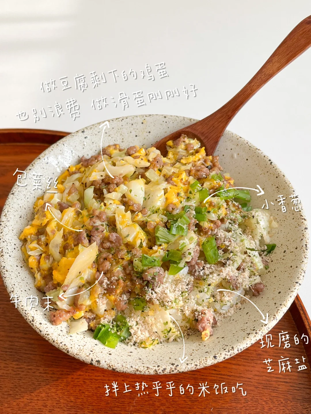 “饮食最重要的是平衡,不要偏食,尽量什么都吃一点。食谱丰富了以后,基本不会太嘴馋,想吃炸豆腐就去做,只不过换个方式用空气炸锅热量会更低~” 今日午餐: ¹包菜肉末滑蛋饭 ²柴鱼豆腐 ³香芋香菜汤