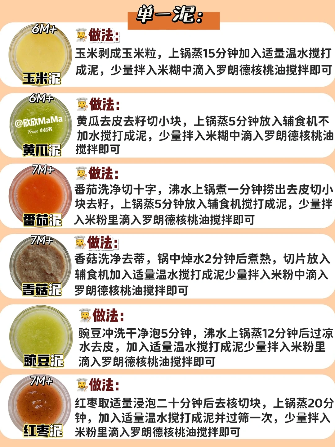 宝宝辅食什么时候添加?辅食泥这么做? 如果你还不清楚,那就来看看这篇保姆级的辅食泥教程附详细做法,希望整理的资料对你们有用!新手爸妈一定要收藏起来✅ 〰️〰️ 🔻什么时候添加辅食? 宝宝5-6个月开始添加辅食 初添加辅食建议安排上上午10点,更便于观察宝宝是否对食物过敏 . 🔻添加辅食顺序 第一口辅食:高铁米粉 🌟米粉冲泡方法:先倒入60度温水到碗中,加入适量米粉,静待30秒,用勺子顺时针搅拌均匀 . 宝宝添加高铁米粉一周后,就可以在辅食里添加辅食泥啦!刚开始从根茎泥开始,添加辅食2周后就可以添加辅食油啦! . ⚠️ 每添加一种食材3天排敏期,如辅食泥第一天1-2勺,第2天2-3勺逐渐增加拌入米糊里滴入罗朗德核桃油,水果泥单独吃! . 🔻罗朗德核桃油 这款辅食油我也是一直在用的,它的亚油酸亚麻酸高达75%,不饱和脂肪酸高达90%,口感清淡,宝宝容易接受,而且是金属包装,避光性好,可以更好的保存保证营养的不流失,每次我做辅食我都会滴几滴,宝宝爱吃,用的放心. . 🔻单一泥(根茎泥) 🕒:吃米粉一周 🛒食材:胡萝卜、土豆、南瓜等 👩‍🍳统一做法:食材削皮切块,上锅蒸15-20分钟加入适量温水搅打成泥少量拌入米糊里滴入罗朗德核桃油 . 🔻蔬菜泥 🕒:吃3-4种根茎泥后 🛒食材:西兰花、菠菜、生菜等 👩‍🍳做法:食材先用盐水浸泡十分钟,用清水反复清洗,水开放入锅中煮熟,加适量温水辅食机搅打呈泥少量拌入米糊里滴入罗朗德核桃油 . 🔻水果泥 🕑:添加辅食半个月后,安排在午睡后吃 🛒食材:苹果、香蕉、牛油果、雪梨等 👩‍🍳做法:直接刮泥勺刮出泥或削皮切块辅食机搅打呈泥(小月龄宝宝水果可蒸几分钟) . 🔻肉泥 🕐:7-8月逐渐增加 🛒食材:鸡肉、猪肉、鱼肉、牛肉、 👩‍🍳做法:食材洗净用生姜水浸泡十分钟去腥,锅中焯水去浮沫冲洗几遍,上蒸锅蒸20分钟加适量温水辅食机搅打呈泥少量拌入米糊里滴入罗朗德核桃油 . 🔻混合泥 🕐:7-8月逐渐增加 ⚠️食材必须先排敏再混合吃 详细做法👀图6-7 . 整理的资料希望对你们有用,有问题也可以评论区留言哦! 💡关注我带您解锁更多辅食制作