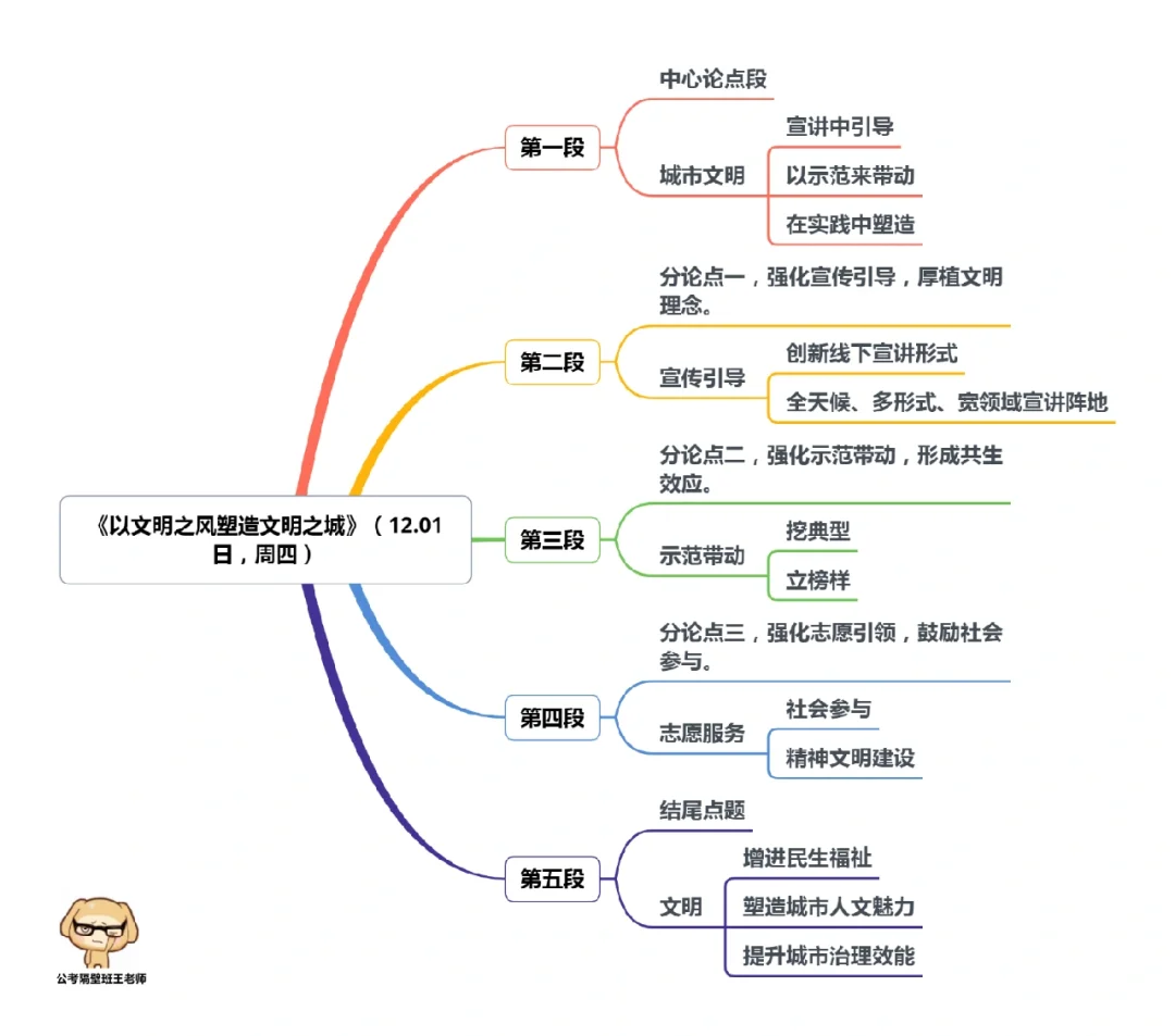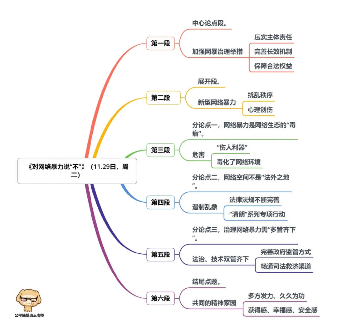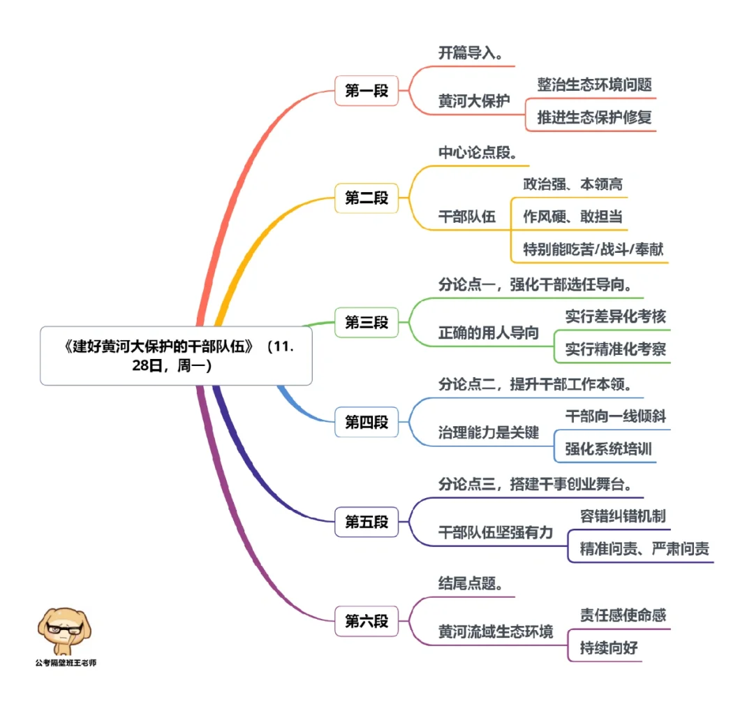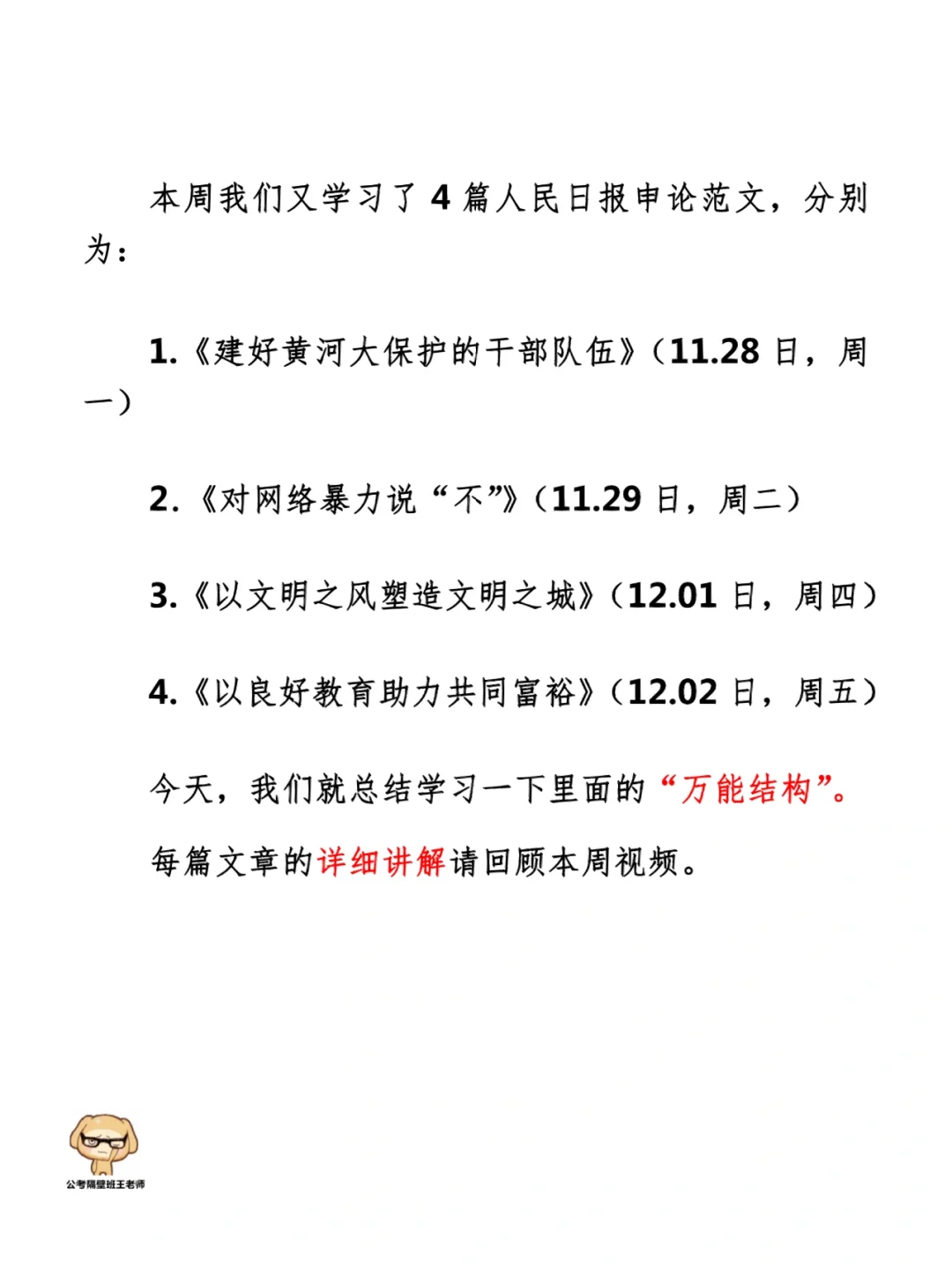 本周我们又学习了4篇人民日报申论范文,分别为: 1.《建好黄河大保护的干部队伍》(11.28日,周一) 2.《对网络暴力说“不”》(11.29日,周二) 3.《以文明之风塑造文明之城》(12.01日,周四) 4.《以良好教育助力共同富裕》(12.02日,周五) 今天,我们就总结学习一下里面的“万能结构”。 每篇文章的详细讲解请回顾本周视频。 ⭐⭐⭐⭐⭐⭐ 这里是公考隔壁班王老师独创的“每天半小时・申论80分”抄写团,欢迎加入我们!