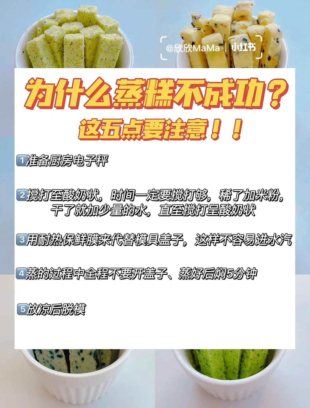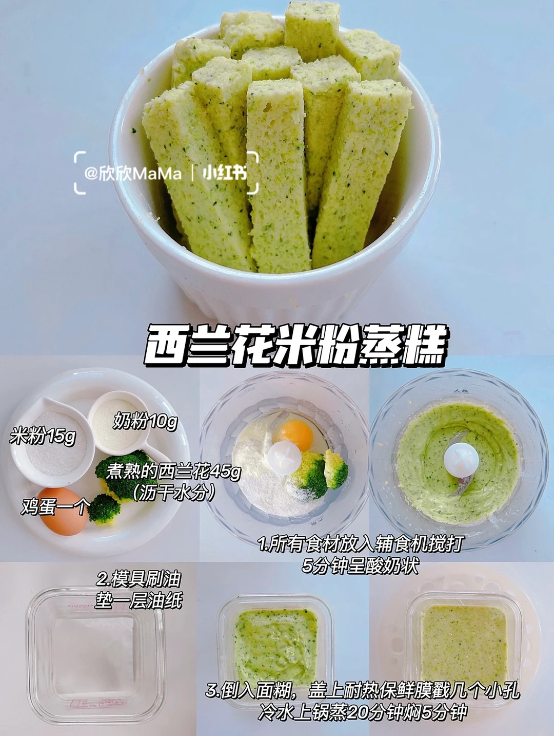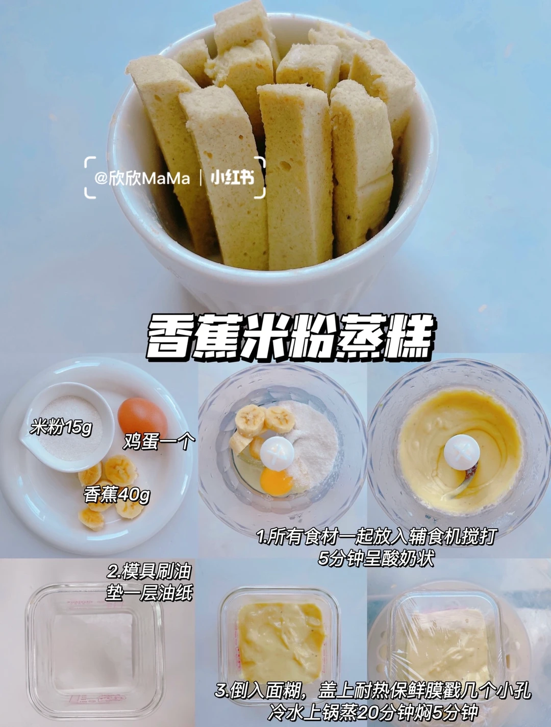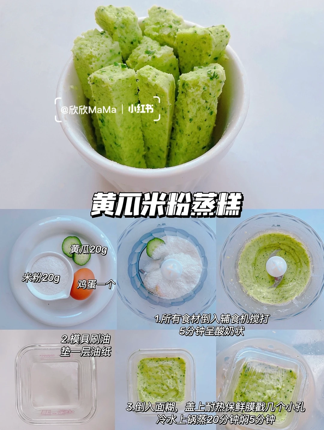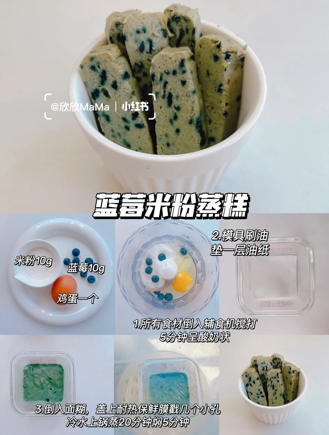 你们天天问的面粉能不能换成米粉版的,今天来分享第2期哦~ 按教程做,一次成功!米粉蒸糕相对面粉蒸糕更易消化,软糯营养又好吃,适合第一次吃手指食物或还没长牙的宝宝尝试! 〰️〰️ 🌈6款蒸糕详细做法👀图3-图8 🔸黄瓜米粉蒸糕 🛒食材:米粉20、黄瓜20g、鸡蛋一个 . 🔸香蕉米粉蒸糕 🛒食材:米粉15g、鸡蛋一个、香蕉40g . 🔸西兰花米粉蒸糕 🛒食材:米粉15g、奶粉10g、煮熟西兰花45g、鸡蛋一个 . 🔸紫薯米粉蒸糕 🛒食材:米粉15g、鸡蛋一个、水10ml、蒸熟的紫薯40g . 🔸原味鸡蛋米粉 🛒食材:米粉20g、鸡蛋一个、配方奶10ml、黑芝麻少许 . 🔸蓝莓米粉蒸糕 🛒食材:蓝莓10g、米粉10g、鸡蛋一个 . ⚠️一次成型的注意事项: 1️⃣准备厨房电子秤 2️⃣搅打总时长要超过5分钟,但是要打打停停,要不然机器容易损坏 3️⃣模具要刷油,垫油纸 4️⃣蒸碗要盖耐热保鲜膜或包锡纸都可,然后用牙签戳几个小孔,这样不容易进水汽 5️⃣蒸的过程中全程不能开锅盖,中小火就可,蒸好后焖5分钟 6️⃣放凉后脱模 7️⃣西兰花焯水后要沥干水分,蛋清没排敏的可以用2各蛋黄来代替 . 做法简单,又营养好吃!妈妈们快收藏起来哦! 有疑问🤔️也可以评论区留言喔😄 💡关注我带您解锁更多辅食制作 7月龄宝宝辅食|8月龄宝宝辅食|宝宝辅食不重样|手指食物|自主进食|咀嚼能力|米粉花样做法|闲置米粉怎么吃