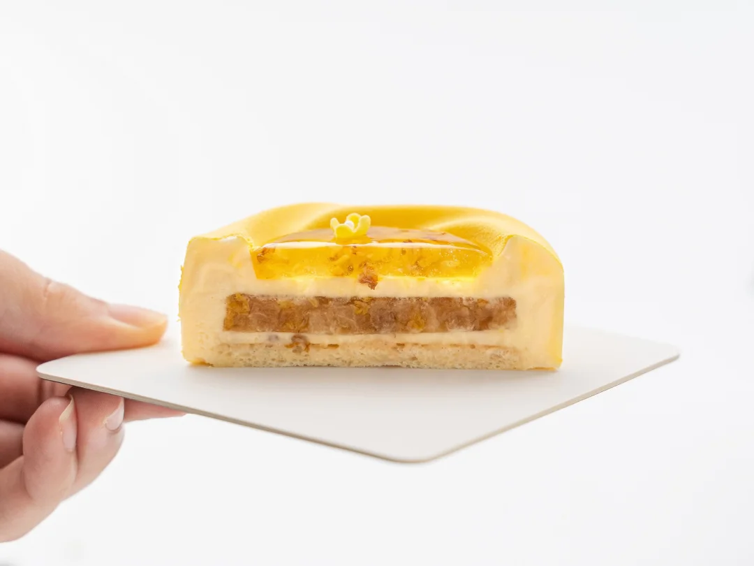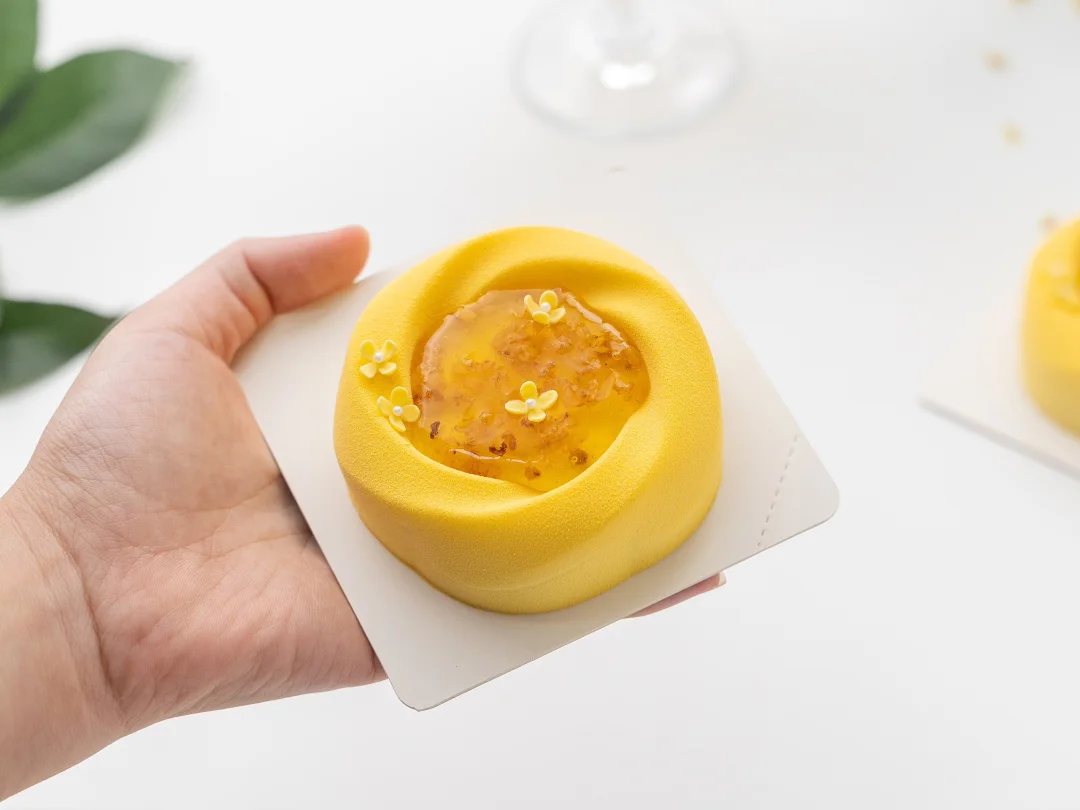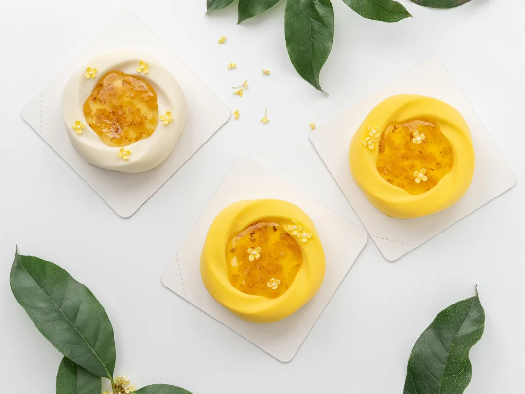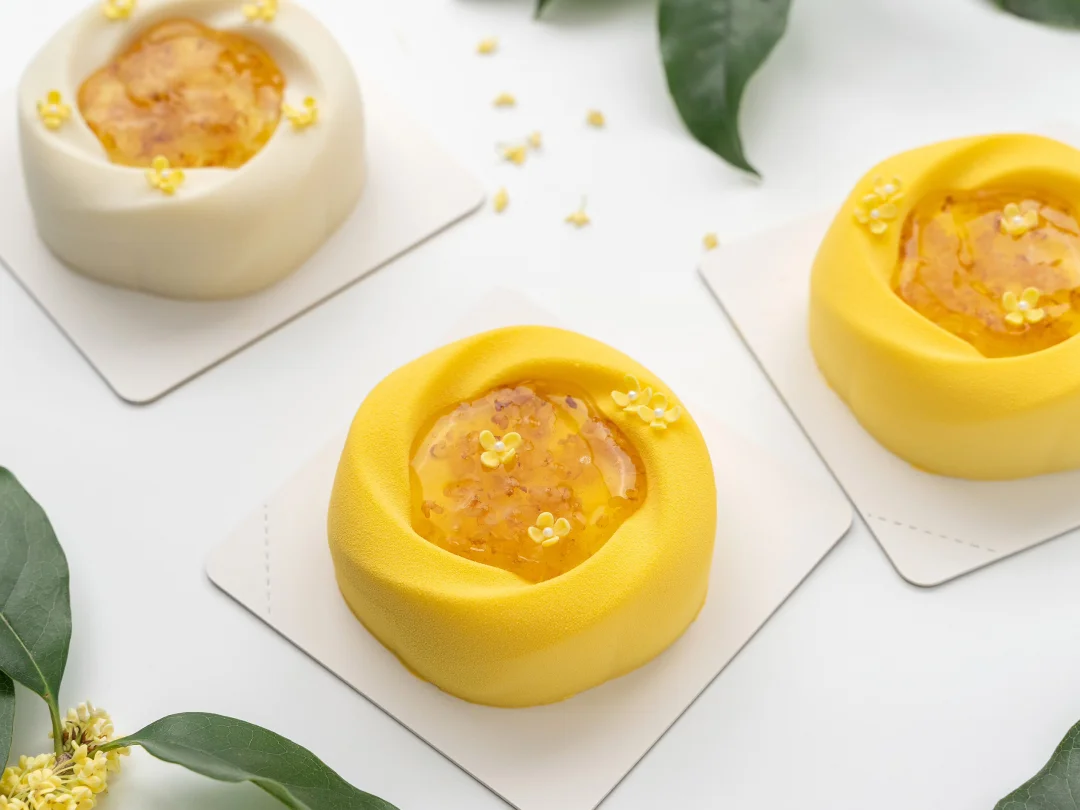 . 🍐桂花开了,今天分享一款桂花米酒酿慕斯 . 🍐配方看图上哦 . 🍐注意要点 1️⃣ 桂花雪梨啫喱 雪梨丁倒入锅中翻炒至微黄,依次加入清水、桂花和提前拌匀的NH果胶和砂糖,搅拌加热煮至沸腾离火,加入吉利丁冻搅拌融化均匀,装入到6连圆柱模具约0.8cm高度,轻轻震匀后冷冻冻硬。 . 2️⃣ 桂花蛋糕 1、鸡蛋、糖粉和杏仁粉混合搅打均匀。 2、蛋清和砂糖打发至呈小尖钩状,分次加入到步骤1的鸡蛋糊中翻拌均匀,过筛筛入低筋粉拌匀。 3、倒在烤盘中抹平抹匀,先在表面撒上适量冻干桂花,再筛上适量糖粉。 4、平炉上下火170°C烤制10分钟左右,出炉冷却后刻印成直径6.3cm的圆形蛋糕片备用。 . 3️⃣ 米酒酿慕斯 1、蛋黄、砂糖和玉米淀粉混合搅匀。 2、酒酿和牛奶加热煮沸后离火,慢慢冲入到蛋黄部分中打匀,整体均匀过筛倒回锅中,继续中小火加热煮至83°C离火,加入吉利丁冻搅匀,再加入室温软化的黄油搅拌均匀。 3、分次加入打发至5-6成的淡奶油翻拌成均匀的慕斯液。 . 4️⃣ 桂花糖浆 清水和桂花搅拌加热至40°C,倒入提前拌匀的NH果胶和砂糖,继续搅拌加热煮沸,加入柠檬酸溶液,再次搅拌煮沸后离火,降温至35°C以下备用(注意要保持糖浆流动性)。 . 5️⃣ 成品组装 1、在模具中注入适量慕斯液并进行挂壁操作,放入脱模的桂花雪梨啫喱,继续注入一层慕斯液,放入蛋糕片轻轻压平,整理多余慕斯液后冷冻冻硬。 2、冻硬的慕斯脱模,取一半整体均匀喷涂上米白色喷砂液,另一半喷涂上黄色喷砂液,温度为35-40°C。 3、在慕斯顶部凹陷处装入适量桂花糖浆,再装饰上翻糖小桂花即可,桂花的尺寸为对角长1cm。 .