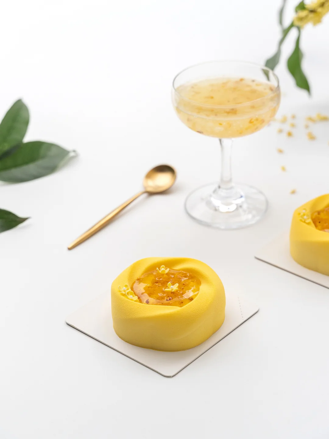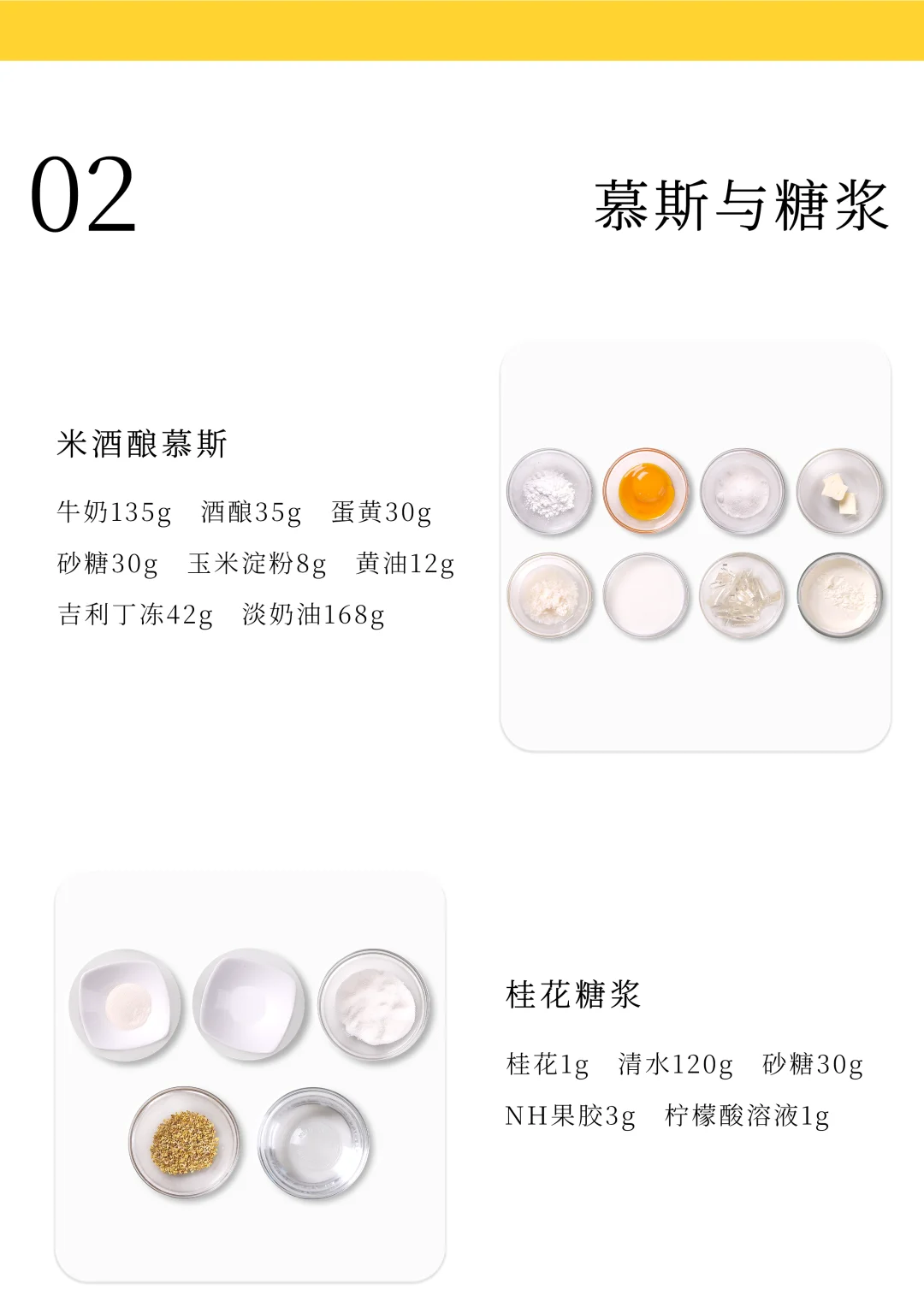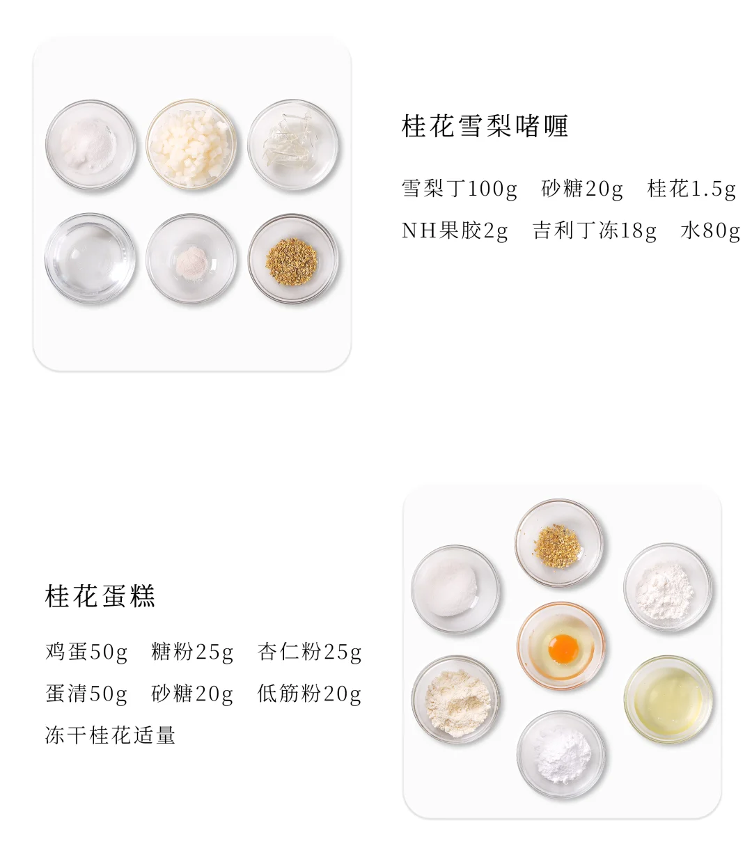 . 🍐桂花开了,今天分享一款桂花米酒酿慕斯 . 🍐配方看图上哦 . 🍐注意要点 1️⃣ 桂花雪梨啫喱 雪梨丁倒入锅中翻炒至微黄,依次加入清水、桂花和提前拌匀的NH果胶和砂糖,搅拌加热煮至沸腾离火,加入吉利丁冻搅拌融化均匀,装入到6连圆柱模具约0.8cm高度,轻轻震匀后冷冻冻硬。 . 2️⃣ 桂花蛋糕 1、鸡蛋、糖粉和杏仁粉混合搅打均匀。 2、蛋清和砂糖打发至呈小尖钩状,分次加入到步骤1的鸡蛋糊中翻拌均匀,过筛筛入低筋粉拌匀。 3、倒在烤盘中抹平抹匀,先在表面撒上适量冻干桂花,再筛上适量糖粉。 4、平炉上下火170°C烤制10分钟左右,出炉冷却后刻印成直径6.3cm的圆形蛋糕片备用。 . 3️⃣ 米酒酿慕斯 1、蛋黄、砂糖和玉米淀粉混合搅匀。 2、酒酿和牛奶加热煮沸后离火,慢慢冲入到蛋黄部分中打匀,整体均匀过筛倒回锅中,继续中小火加热煮至83°C离火,加入吉利丁冻搅匀,再加入室温软化的黄油搅拌均匀。 3、分次加入打发至5-6成的淡奶油翻拌成均匀的慕斯液。 . 4️⃣ 桂花糖浆 清水和桂花搅拌加热至40°C,倒入提前拌匀的NH果胶和砂糖,继续搅拌加热煮沸,加入柠檬酸溶液,再次搅拌煮沸后离火,降温至35°C以下备用(注意要保持糖浆流动性)。 . 5️⃣ 成品组装 1、在模具中注入适量慕斯液并进行挂壁操作,放入脱模的桂花雪梨啫喱,继续注入一层慕斯液,放入蛋糕片轻轻压平,整理多余慕斯液后冷冻冻硬。 2、冻硬的慕斯脱模,取一半整体均匀喷涂上米白色喷砂液,另一半喷涂上黄色喷砂液,温度为35-40°C。 3、在慕斯顶部凹陷处装入适量桂花糖浆,再装饰上翻糖小桂花即可,桂花的尺寸为对角长1cm。 .