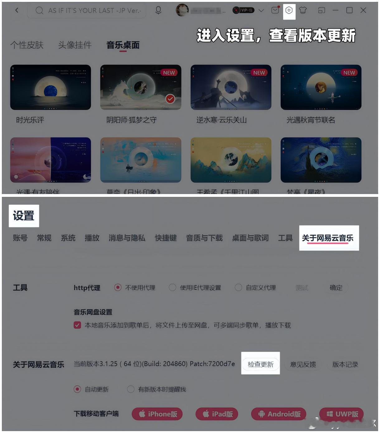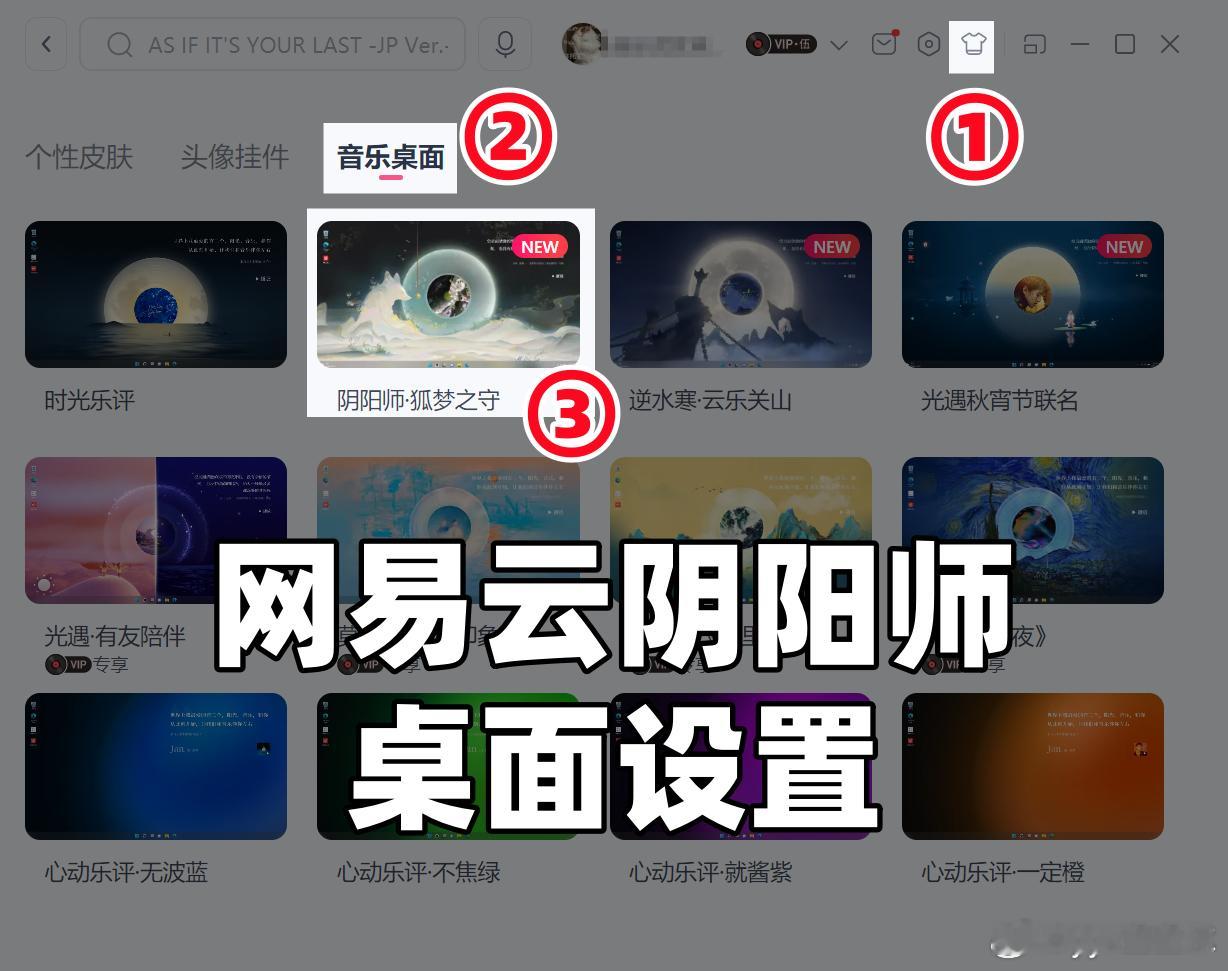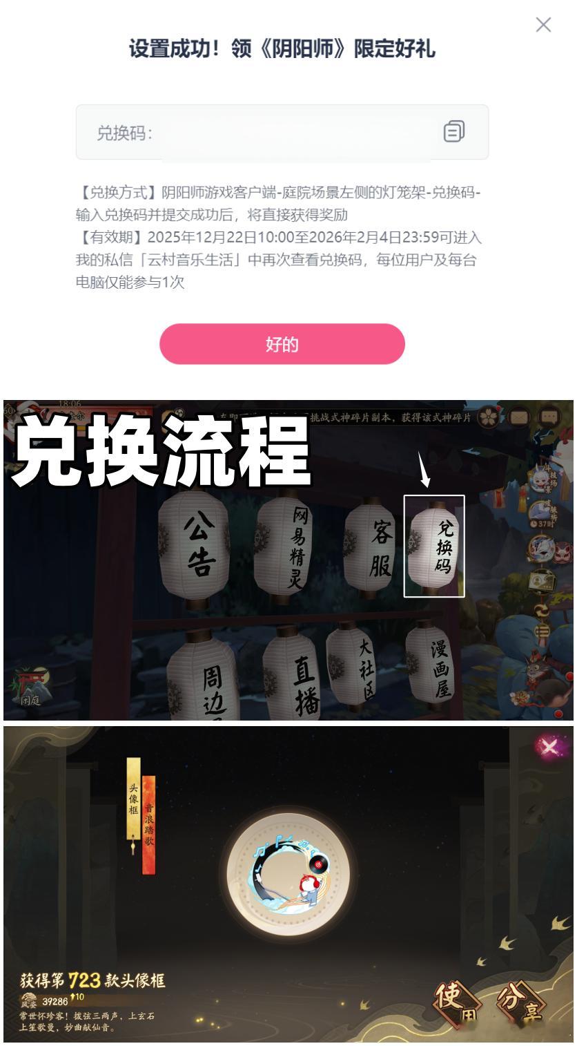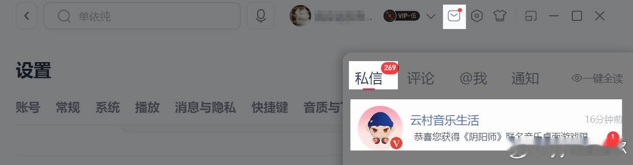 阴阳师手游超话创作官acg优创官 网易云音乐x《阴阳师》联动头像框,保姆级领取教程①进入电脑端网易云音乐②右上角进入设置,查看版本是否为最新(图二)③右上角点皮肤→音乐桌面→立即使用(图三)④弹出兑换码,在游戏庭院左侧灯笼架兑换领取(图四)⑤网易云客户端右上角私信→可再次查看兑换码(图五)游戏百科