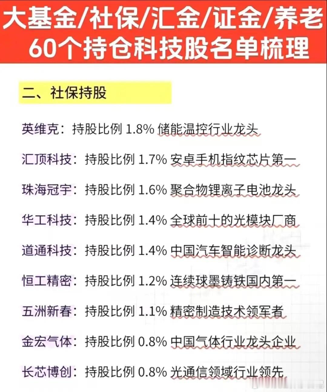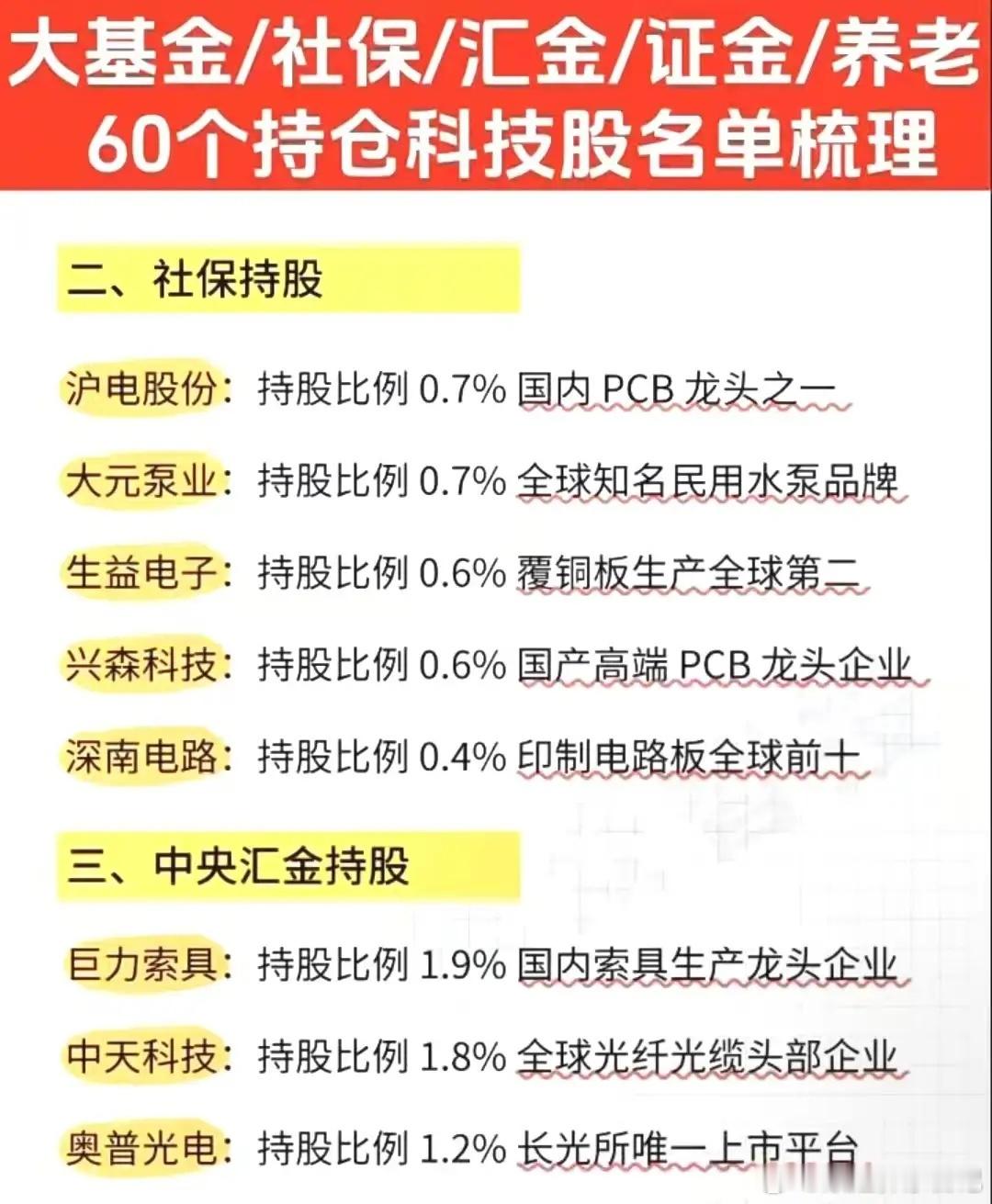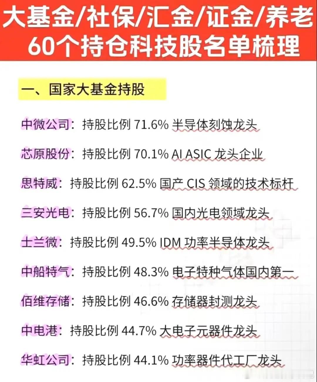 重磅!2025国家队科技股持仓名单出炉 60只标的覆盖四大核心赛道国家队持仓大曝光!国家大基金、社保、汇金、证金、养老保险五大主力联手布局60只科技标的,精准覆盖半导体、光通信、精密制造、储能等硬核赛道!各大主力持仓偏好泾渭分明:国家大基金重仓中芯国际、北方华创等半导体龙头,锚定芯片产业攻坚核心; 社保基金瞄准光模块、PCB等细分冠军,深挖赛道隐形王者;汇金、证金聚焦通信、声学设备领域,筑牢科技基建底盘;养老保险卡位低空经济、光电子等新赛道,抢占未来增长先机。国家队投资版图高度契合科技产业攻坚方向,信号意义拉满!⚠️ 理财有风险,入市需谨慎。资料取材网络,仅供参考,不构成投资依据