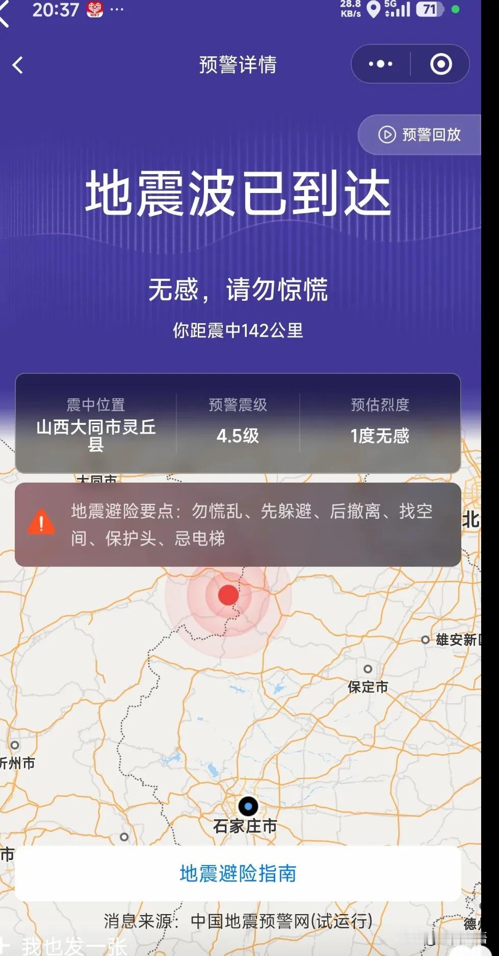 【地震了吗?石家庄】后来刷视频,看到有人说,地震了!是真的吗?一点感觉没有啊! 昨天晚上,8点30分左右!有人手机收到地震预警!我的是没有收到地震预警!你的收到了吗?有人说,长安区,感觉到了,以为孩子在踢桌子,还以为自己头晕了呢?也有的说,桥西红旗大街感觉到了,不太明显,以为没睡够人晕呢?真有,我正在床上躺着呢,我靠 很明显楼晃动了两下,我就坐起来了? 你感觉到了吗?我在石家庄,没感觉到!昨天晚上8点半左右,你感觉到了吗? 晒图笔记大赛 地震预警 信息图片来源网络侵权联删