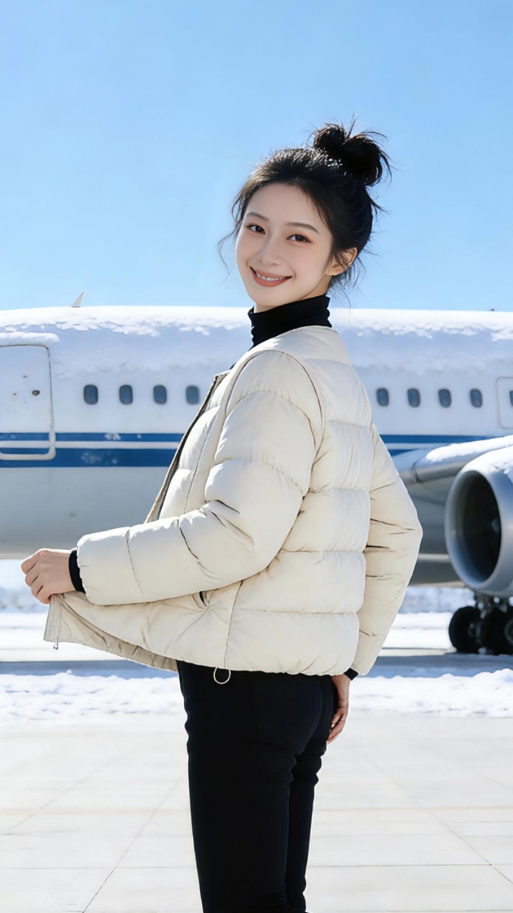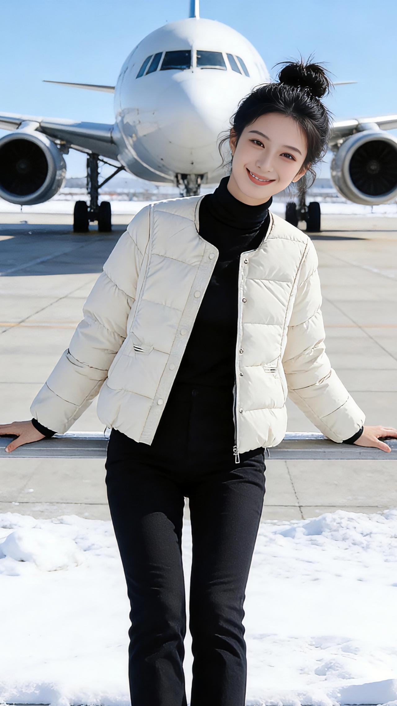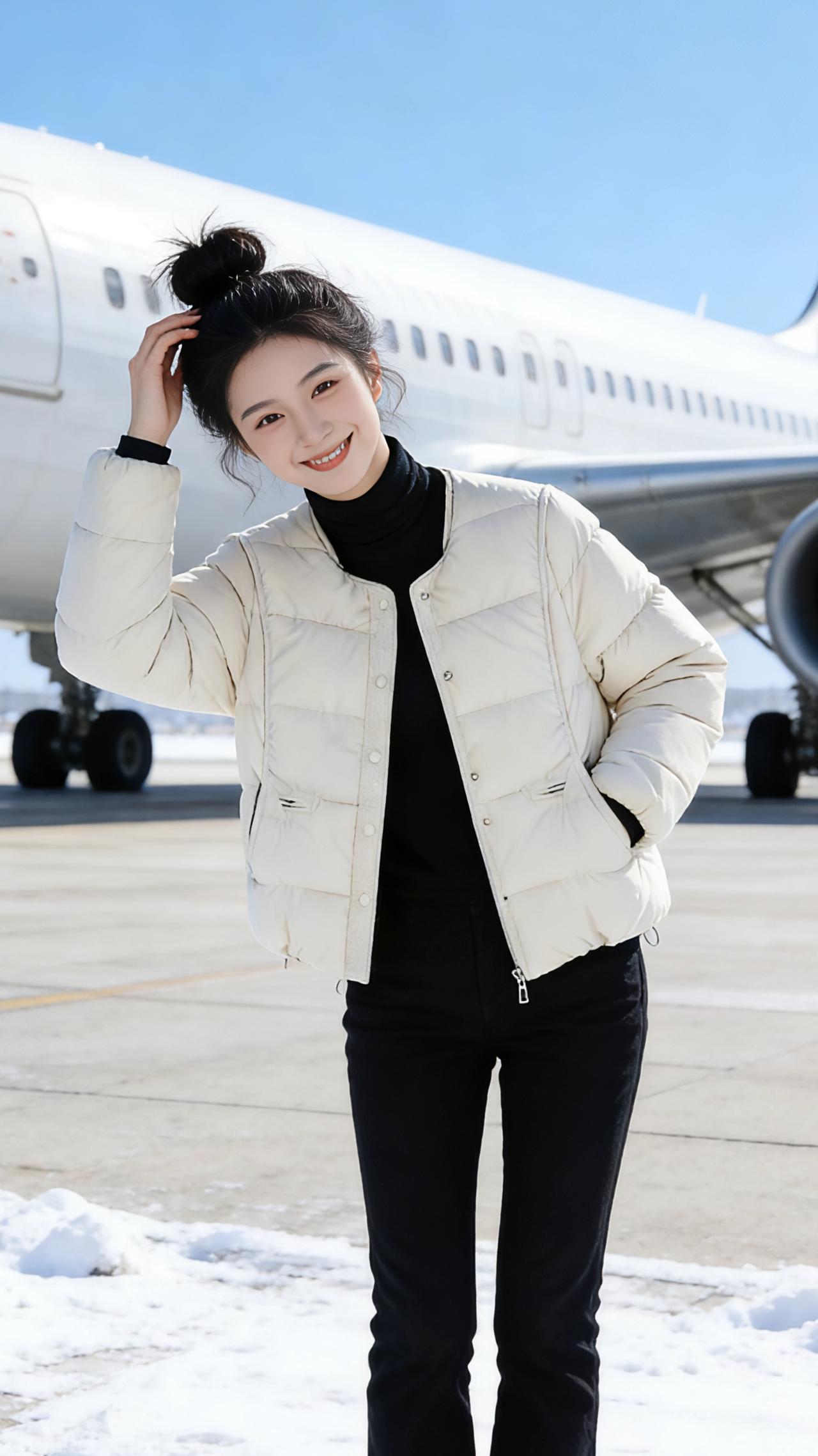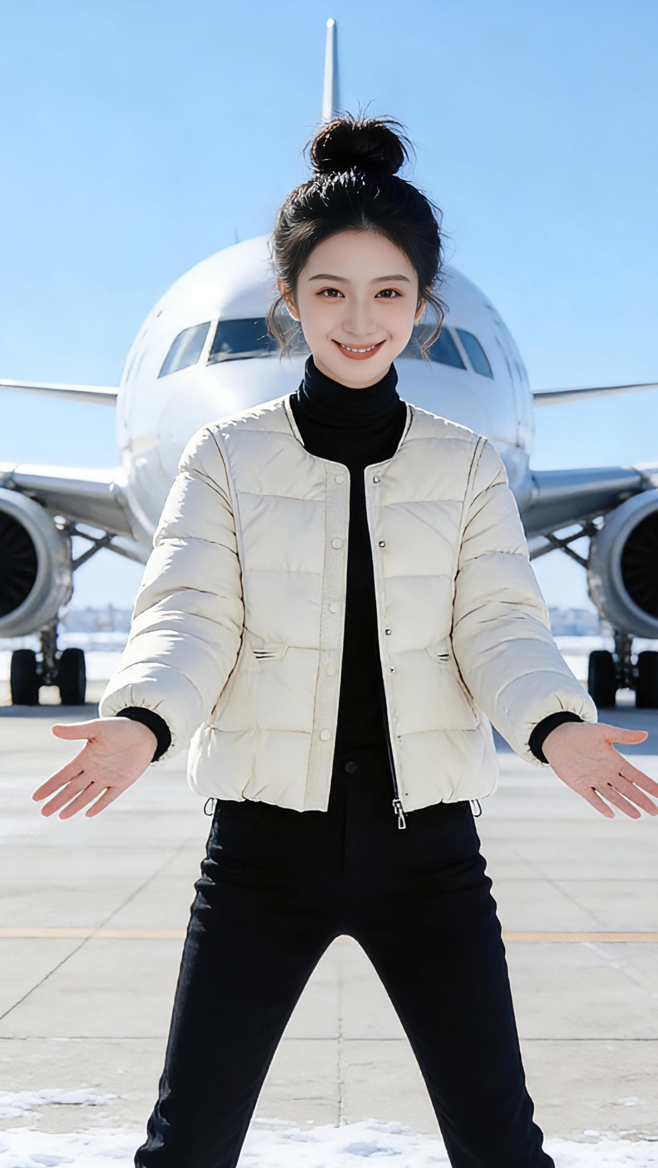 空港冬日 雪沫还凝在停机坪的水泥缝里,阳光却已把天空洗成澄澈的蓝。客机的银白机身在光影里泛着冷光,引擎的轮廓像沉默的巨兽,守着这片被冰雪吻过的空港。 她立在机前,米白短款羽绒服裹着一身利落,黑高领的线条衬得脖颈纤长,丸子头的碎发被风拂起,添了几分随性。双臂交叠时,是与钢铁机翼相映的飒爽;抬手拢发时,指尖掠过发梢的弧度,又揉进了冬日暖阳的温柔。 伸手展臂的瞬间,像要拥住整片蓝天与机翼的交响;轻扯衣摆回眸时,笑意落在雪光里,碎成星子。空港的风掠过,带着薄雪的清冽,她的身影融在飞机的硬朗与冬日的柔软之间,成了这片钢铁空域里,最生动的一抹人间烟火。 高级感穿搭 小个子穿搭 棉服