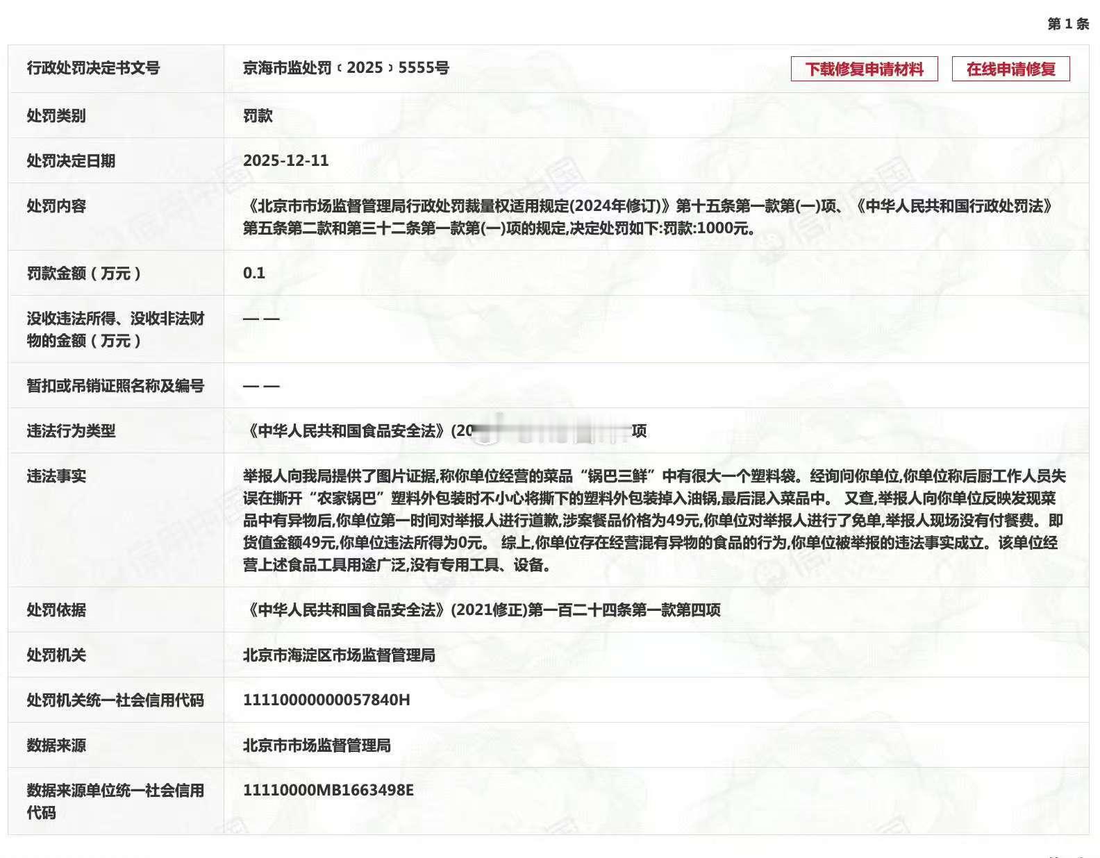 中国新闻网:信用中国网站显示,近日,北京麻六记餐饮管理有限公司清河分店因违反食品安全法,被北京市海淀区市场监督管理局罚款1000元。违法事实显示,举报人向北京市海淀区市场监督管理局提供了图片证据,称该分店经营的菜品“锅巴三鲜”中有很大一个塑料袋。经询问,该分店称后厨工作人员失误在撕开“农家锅巴”塑料外包装时不小心将撕下的塑料外包装掉入油锅,最后混入菜品中。麻六记菜品混入塑料袋被罚麻六记菜品混入大塑料袋