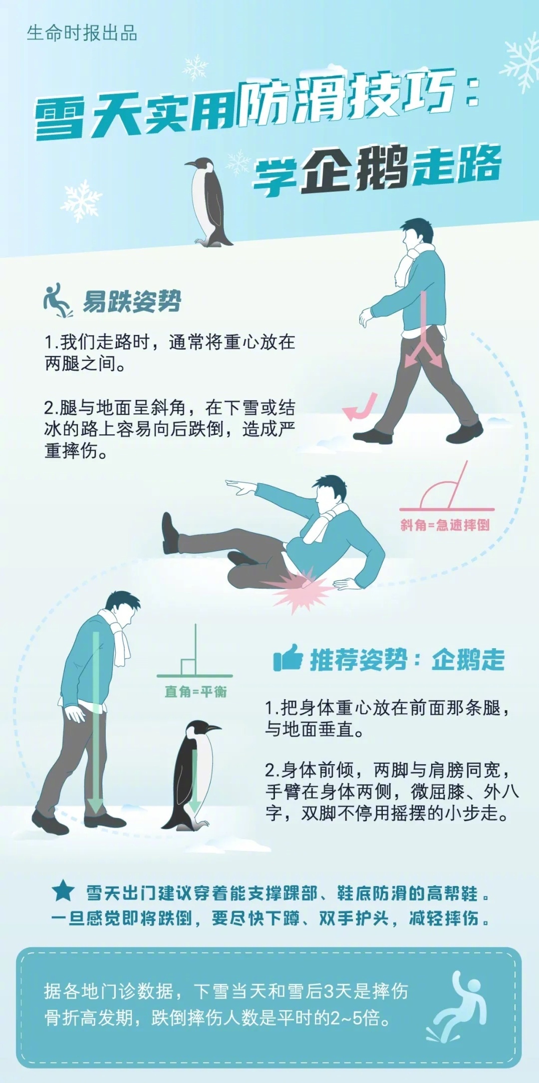 硬核研究所 【雪天防滑倒的走路姿势】雨雪天气,会造成地面湿滑,骨折风险大大提高。摔倒后最易骨折的3个部位分别是腕部、髋部和踝关节,其中,手腕骨折患者一般占雪后骨折患者的60%以上。大多数人滑倒后的第一反应是手撑地,导致摔倒的力量经手腕传导至前臂,从而形成桡骨远端骨折。雪后出行,街面最滑的地方其实有规律可循。在经过这些地方时,人们应格外注意或尽量避开。①斑马线一些斑马线是漆面材质,为的是在夜晚反光提醒路人,但雪后会比较滑;有些斑马线本来不滑,但随着反光面被使用磨损,走起来也容易打滑。不过,现在已有很多城市开始使用防滑材质的斑马线,这样比较安全。②停车场和加油站出入口这些地方因汽车通行频繁,雪会被压得很实,加上轮胎摩擦,会变得非常滑。另外,这些地方也常有斜坡。公交车站也是易摔倒的地方,尤其是上下车时重心不稳要小心。③地铁或地下通道出口这些地方人流量大,路面易结冰,且往往有台阶,非常危险。很多人从内部安全的路面走出来,或因通勤等原因走得急,一下子适应不了积雪街道,容易滑倒。④铺瓷砖的地方尤其是踩完雪地刚进入商场,鞋底嵌的雪接触瓷砖会非常滑;最好在门口跺跺脚磕掉雪再进去。雪天走路切记“急”,且不要看手机或打电话,双手尽量不要提重物也不要双手插兜,以免不慎摔倒很难迅速做出反应。此时,学一套走路技巧,让摔倒的几率能大幅减少。↓↓ 北京下雪(生命时报)